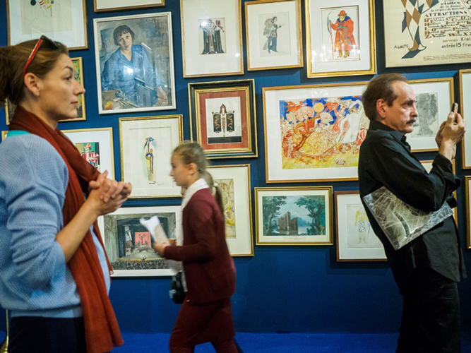© Надя Плунгян «100+10». Фрагмент экспозиции. В центре: Наталья Гончарова. Эскиз декорации к опере-балету «Золотой петушок» Н. Римского-Корсакова. Труппа «Русский балет Дягилева». 1914. Дар Нины Лобановой-Ростовской Гвоздь экспозиции — дар международного благотворительного фонда «Константиновский» — графические листы из знаменитой коллекции Нины и Никиты Лобановых-Ростовских, дополненные в 2014 году произведениями из личной коллекции Нины Лобановой-Ростовской. Речь идет о безусловных и даже хрестоматийных произведениях театрально-декорационного искусства, чье возвращение в Россию стало этапом (рассказывая о даре на открытии, директор музея Наталия Метелица не смогла сдержать слезы). Дизайнерским решением этой части стала тесная шпалерная развеска, выстроенная почти до потолка в интенсивно-синих стенах центрального зала.