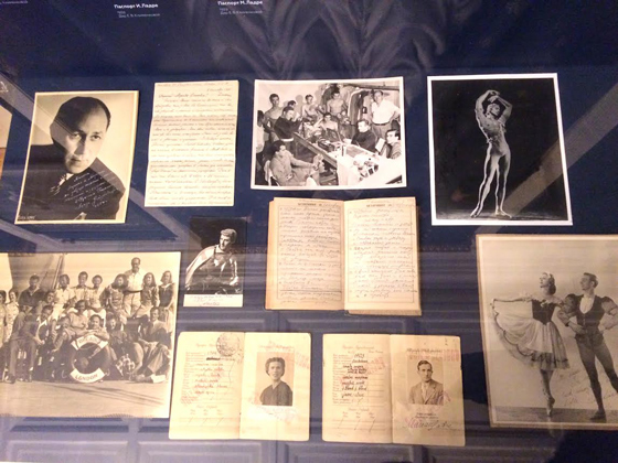© Надя Плунгян «100+10». Фрагмент экспозиции. Документы и фотографии из архива Илларии Ладре «100+10» выстроена как метавыставка: это сквозная навигация-комментарий к основной экспозиции. Она задана музыкальной темой и акцентирующей разметкой глубокого синего цвета: синий выделяет в основной экспозиции отдельные фрагменты, а иногда «проливается» и «расплескивается» на пол и стены целых залов. Отдельными синими включениями стали, например, треугольные движущиеся витрины в зале музыкальных инструментов, выделенные цветом стенды и синие поверхности витрин и столиков в разделе архивов и реликвий.