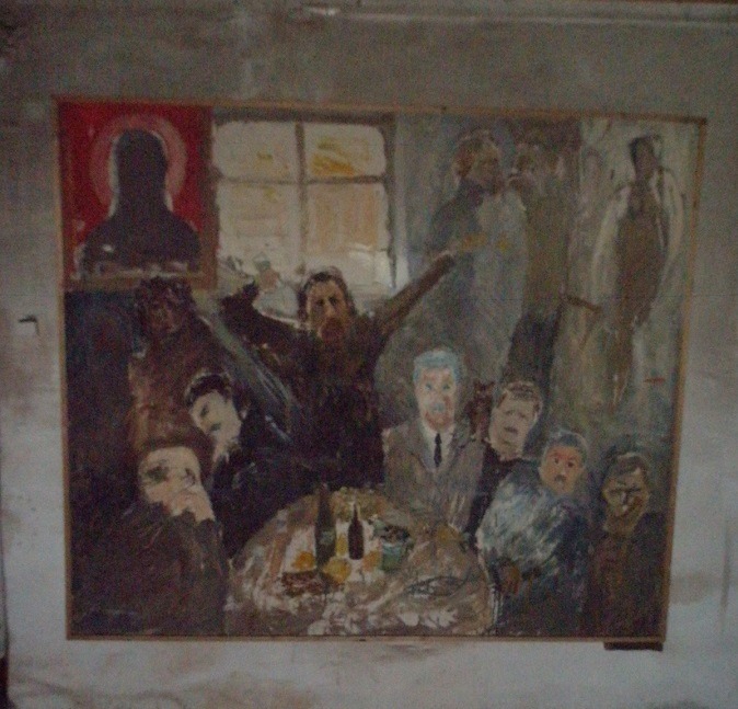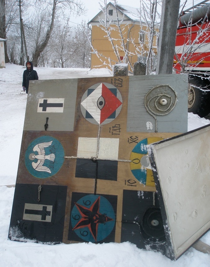 Руководитель Псковского регионального общественного движения «ПсковАрт» Ирина Жбанова неподалеку от входа показывает мне прислонённую к столбу перевёрнутую картину Анатолия Жбанова «Добро и зло». «Зло подгорело», - говорит она.