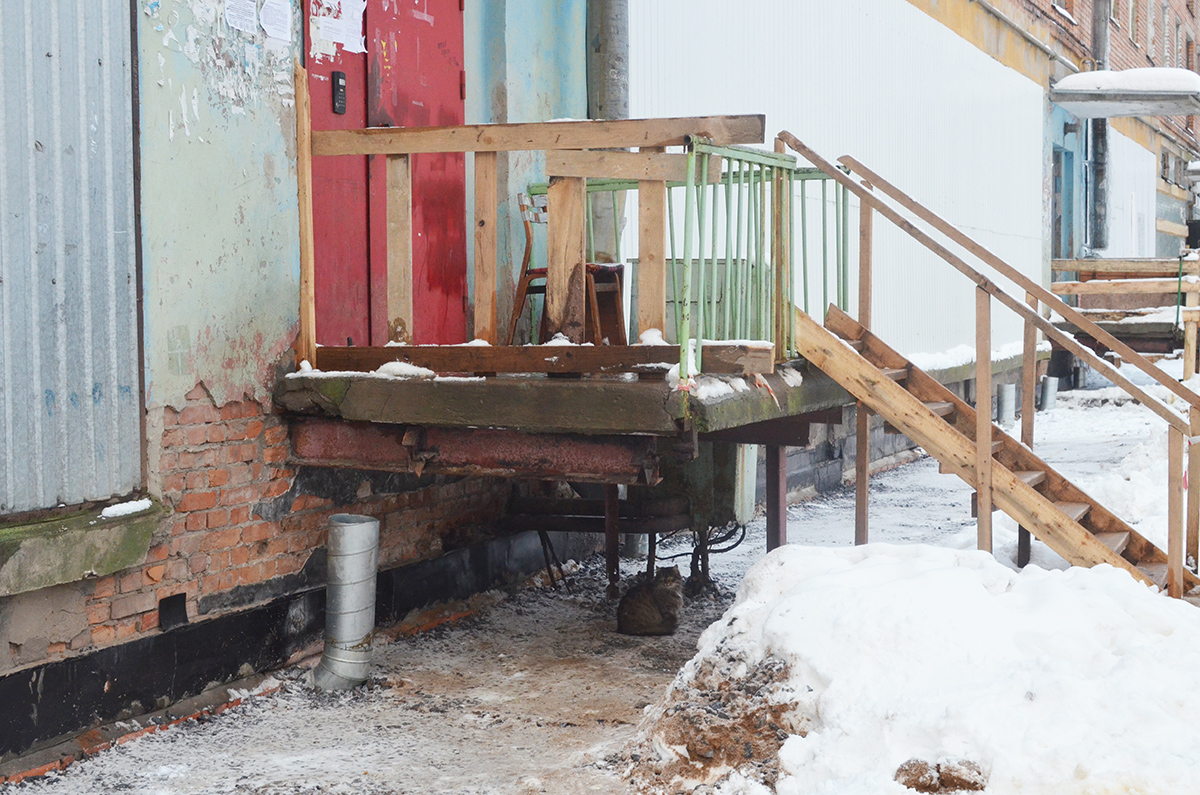 Сам дом выглядит так, будто находится на осадном положении. Разобрана отмостка. Вдоль нее лежат покрытые сугробами кучи гравия. В связи с ремонтом отмостки, лестницы, ведущие к подъездам, убрали, поэтому попасть в дом или выйти из него для многих жильцов — настоящее испытание; для этого нужно пройти по деревянным, скользким и узким ступеням, держась за заснеженные перила.