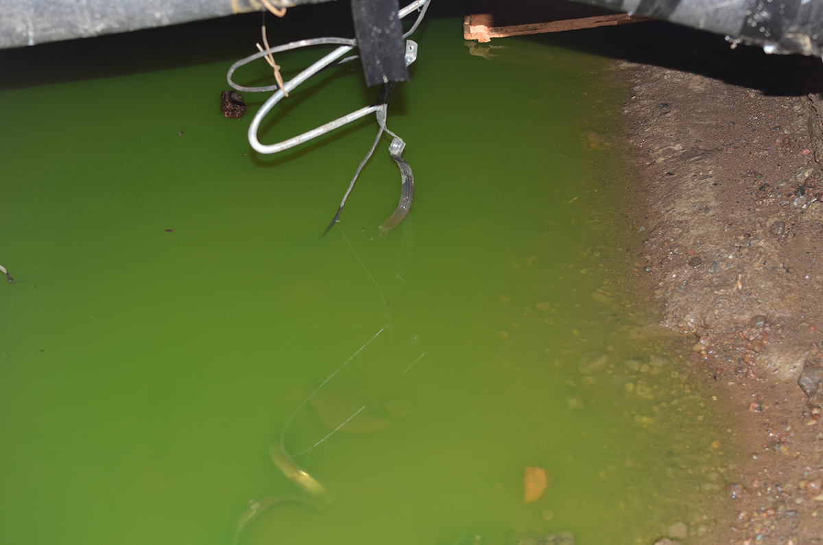 В одной из парадных «пускает одинокую слезу» новый радиатор, а в подвале застыло «изумрудное озеро». Источник этого водоема — в том числе вода из батарей квартир, так как ее подкрашивают в зеленый цвет, чтобы быстро понять, где именно произошла протечка.