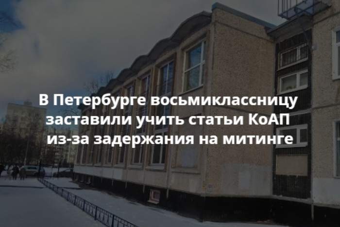 В петербургской школе № 568 социальный педагог заставляла ученицу восьмого класса учить статьи кодекса об административном правонарушении (КоАП) в рамках профилактической беседы. Школьница записала беседу на диктофон, ее расшифровку опубликовало «ОВД-Инфо».