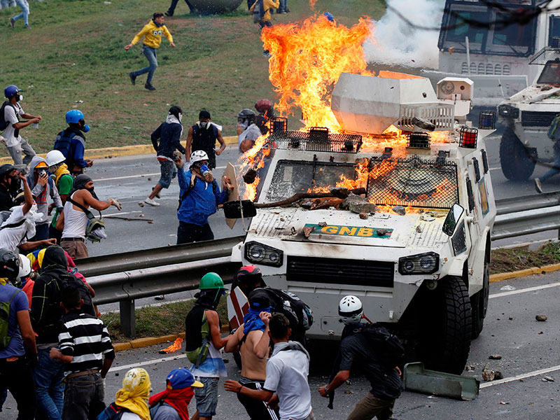 Бронетехника на улицах Каракоса (Венесуэла) / aljazeera.com За время первого срока, который длился шесть лет, в экономике Венесуэлы сложилась катастрофическая ситуация. Экономический кризис привел к гигантской инфляции и нехватке товаров первой необходимости, ВВП упал почти в два раза, из страны уехала десятая часть населения. Мадуро неоднократно пытались отстранить, несколько раз он заявлял, что на него организовано покушение. Последнее произошло в августе 2018-го, в декабре венесуэльский лидер обвинил в его подготовке власти США, Колумбии и Бразилии. Вообще, в нестабильности своего положения Мадуро часто обвиняет Вашингтон, так произошло и на этот раз.