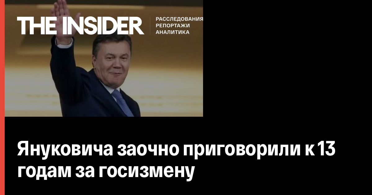 Оболонский районный суд Киева заочно приговорил бывшего президента Украины Виктора Януковича к 13 годам лишения свободы, он признан виновным в государственной измене, сообщает телеканал «Громадське».