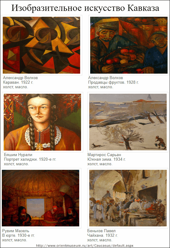 Оказываясь в зале искусства Средней Азии и Кавказа XX века, испытываешь естественное недоумение по поводу объединения Пиросмани, Бенькова, Сарьяна и Волкова в одном пространстве. Настенные комментарии не оставляют сомнений в ориенталистской природе произведенной селекции: «На территориях Кавказа и Средней Азии, исторически связанных с Россией, через русскую культуру происходил диалог Востока и Запада». Взгляд из Москвы на художников с различными творческими траекториями как на представителей некоей «восточной общности» утрированным образом предстает и на сайте музея. В секции Кавказа музейная веб-страница «Искусство Кавказа, Средней Азии и Казахстана» представляет картины Александра Волкова, Бяшима Нурали, Рувима Мазеля и Павла Бенькова, а в секции Средней Азии — живопись Минаса Аветисяна и Акопа Акопяна. Несуразный визуальный винегрет сопровождается сумбурным текстом: например, искусство Азербайджана рассматривается в разделе Средней Азии. Эта безграмотность, невообразимая в современном университетском контексте, характерна для классического ориентализма, для которого существенной оставалась лишь одна граница — между Востоком и Западом, тогда как различия «восточных регионов», от Марокко до Ирана или от Монголии до Индонезии, чудились условными и второстепенными. Ту же поразительную глухоту к специфике и собственной истории локусов Средней Азии и Кавказа проявляют и московские музеологи, для которых главным остается подвести всех работавших в этих регионах художников под общий «восточный знаменатель».