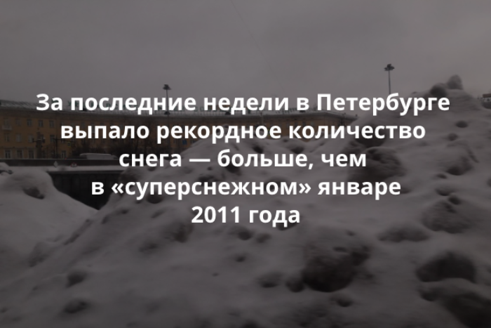За 25 дней января этого года в Петербурге выпало 83 сантиметра снега, таким образом побит рекорд зимы 2011 года — тогда за весь январь выпало 82 см снега. Об этом сообщает комитет по благоустройству. Чиновники отмечают, что январь 2011 года был «суперснежным».