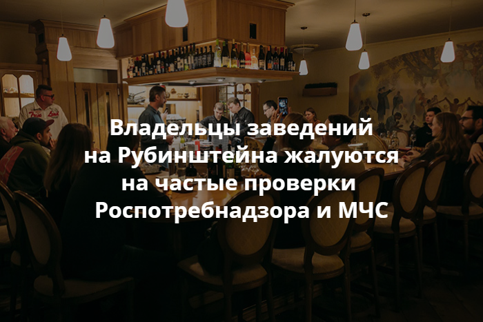 Рестораны и бары на улице Рубинштейна с ноября 2018 года проверяют Роспотребнадзор, МЧС, Федеральная налоговая служба и МВД. По словам рестораторов, с проверкой приходят почти во все заведения из-за коллективных писем жильцов. Участники рынка опасаются, что многие бары и рестораны могут закрыться.
