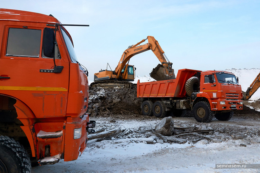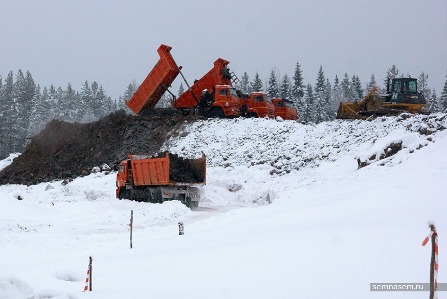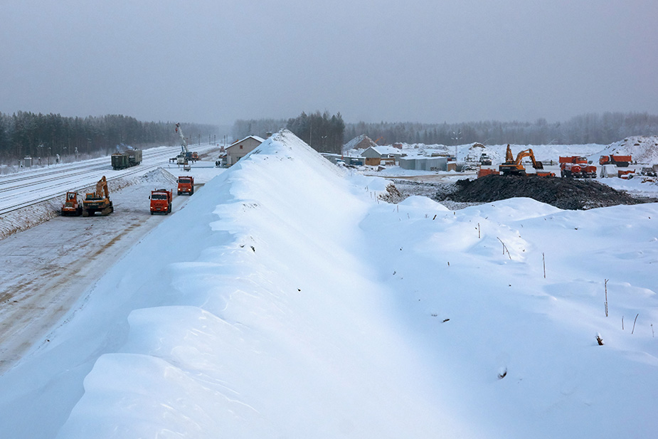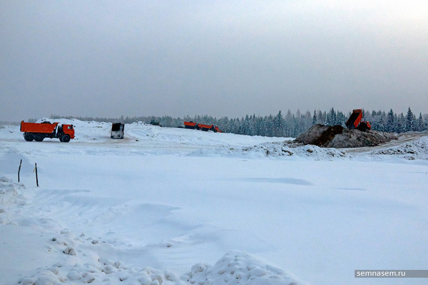 Два экскаватора грузят грунт в КамАЗы, те отвозят землю к железнодорожному переезду и делают насыпь там — минут за 15, пока мы шли вдоль насыпи, мимо нас проехало пять машин. У них разбиты задние фары, на некоторых нет госномеров. Активисты считают, что за насыпью выкапывают котлованы для мусорного полигона, а рабочие говорили им, что территория в 55 га необходима для погрузочно-разгрузочной площадки ООО «РЖД».