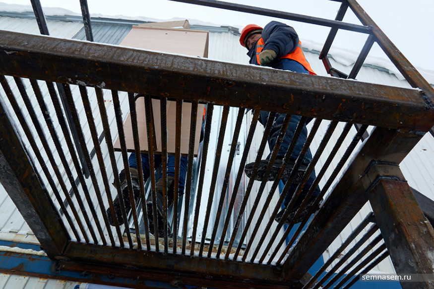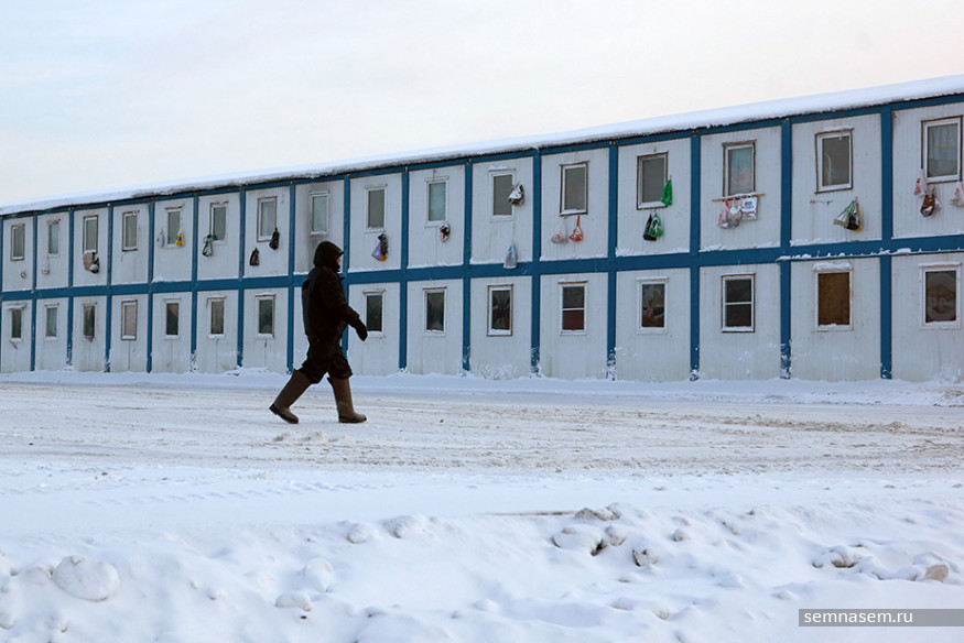 Подошли к двухэтажному общежитию из блоков-вагончиков. Стоя на лестнице, мужчина обивал входную дверь на второй этаж, увидел фотографирующих его активистов, обматерил их и пригрозил кинуть каской, если они продолжат снимать. Практически из каждого окна общежития свисают пакеты — очевидно, с замороженными продуктами, через стекло в некоторых комнатах видны двухъярусные кровати. По словам одного из охранников, в его комнате живут трое.