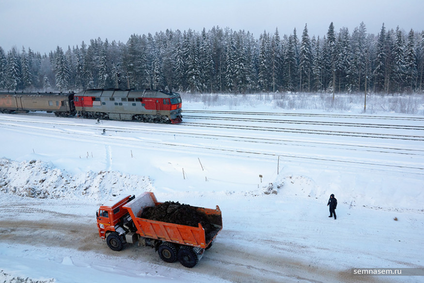 Недалеко от вагончика — железнодорожный переезд. Слева от переезда — большая гора земли, из-за которой с путей не видно работающую технику.