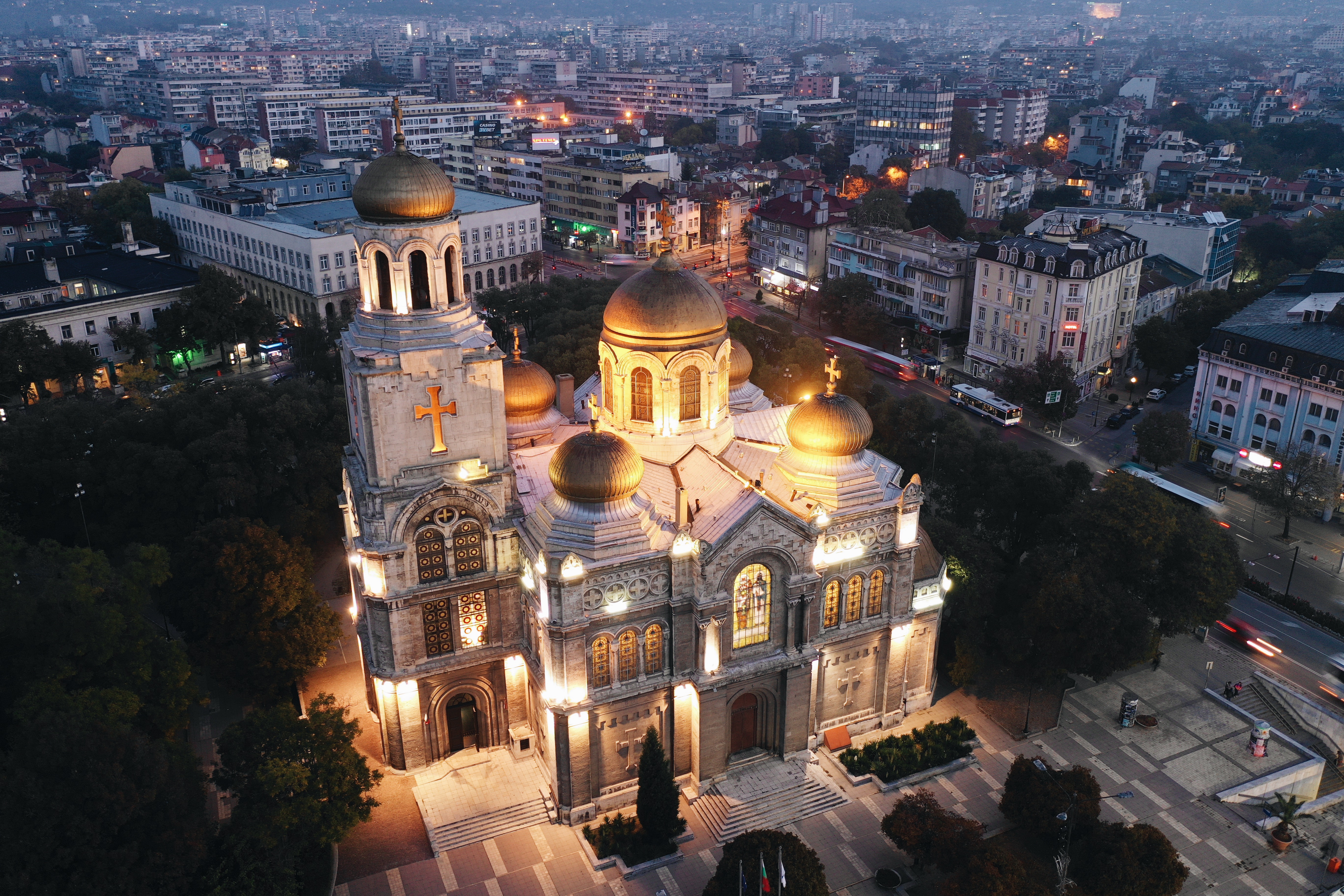 Кафедральный собор Успения Богородицы в Варне ранним хмурым утром.