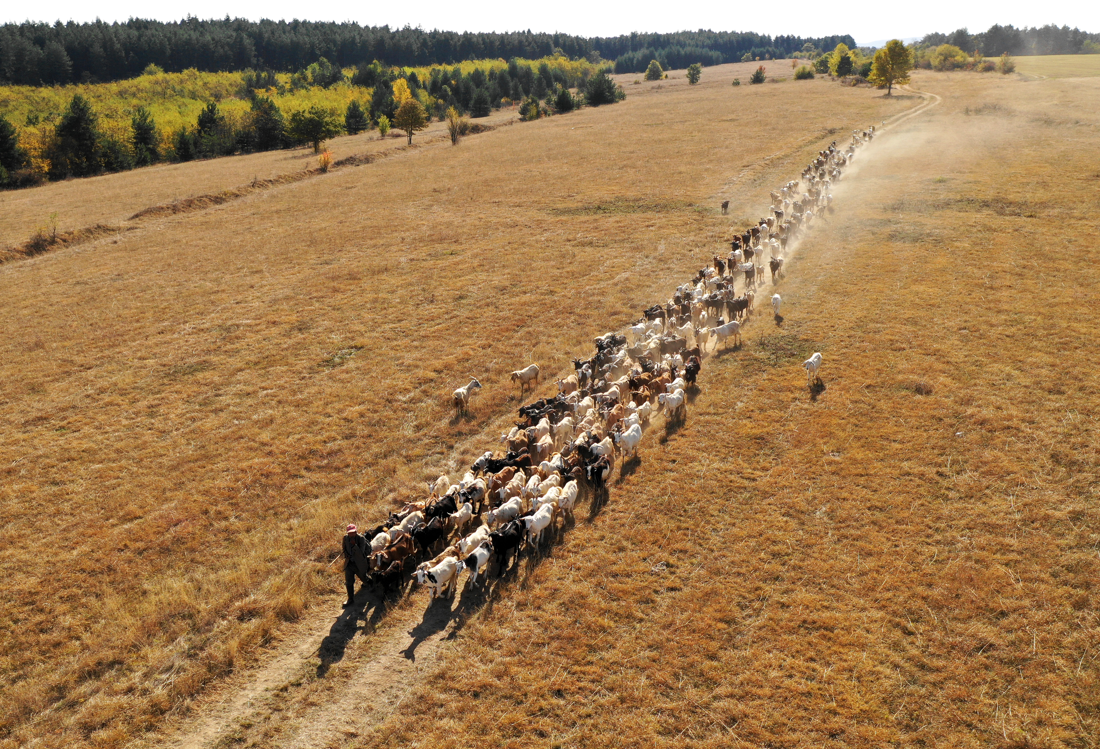 Козы бредут за пастухом по пыльной грунтовой дороге у города Казанлык.
