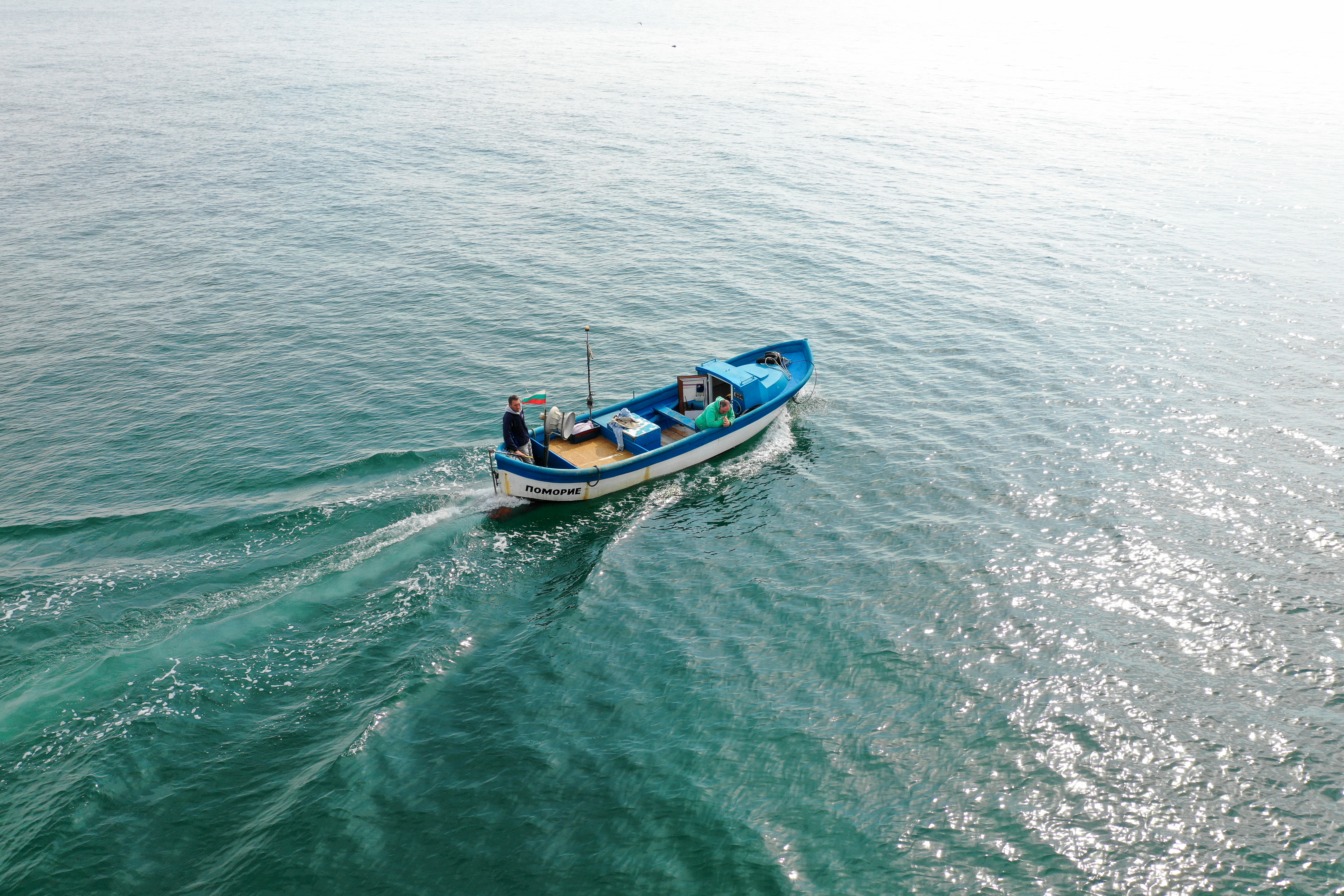 Рыбаки в море недалеко от курорта Поморье. Один разглядывает дно и риф под лодкой.