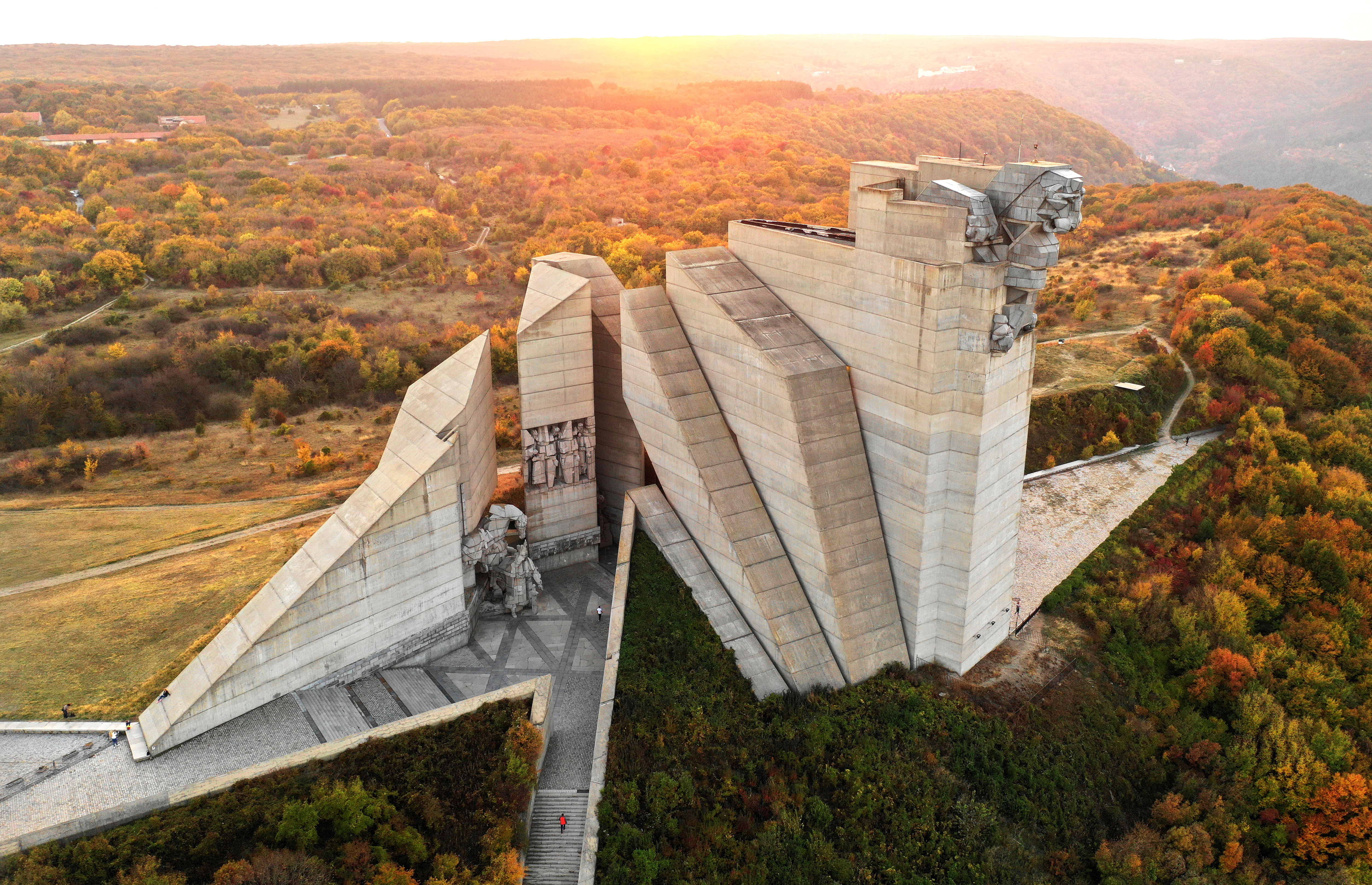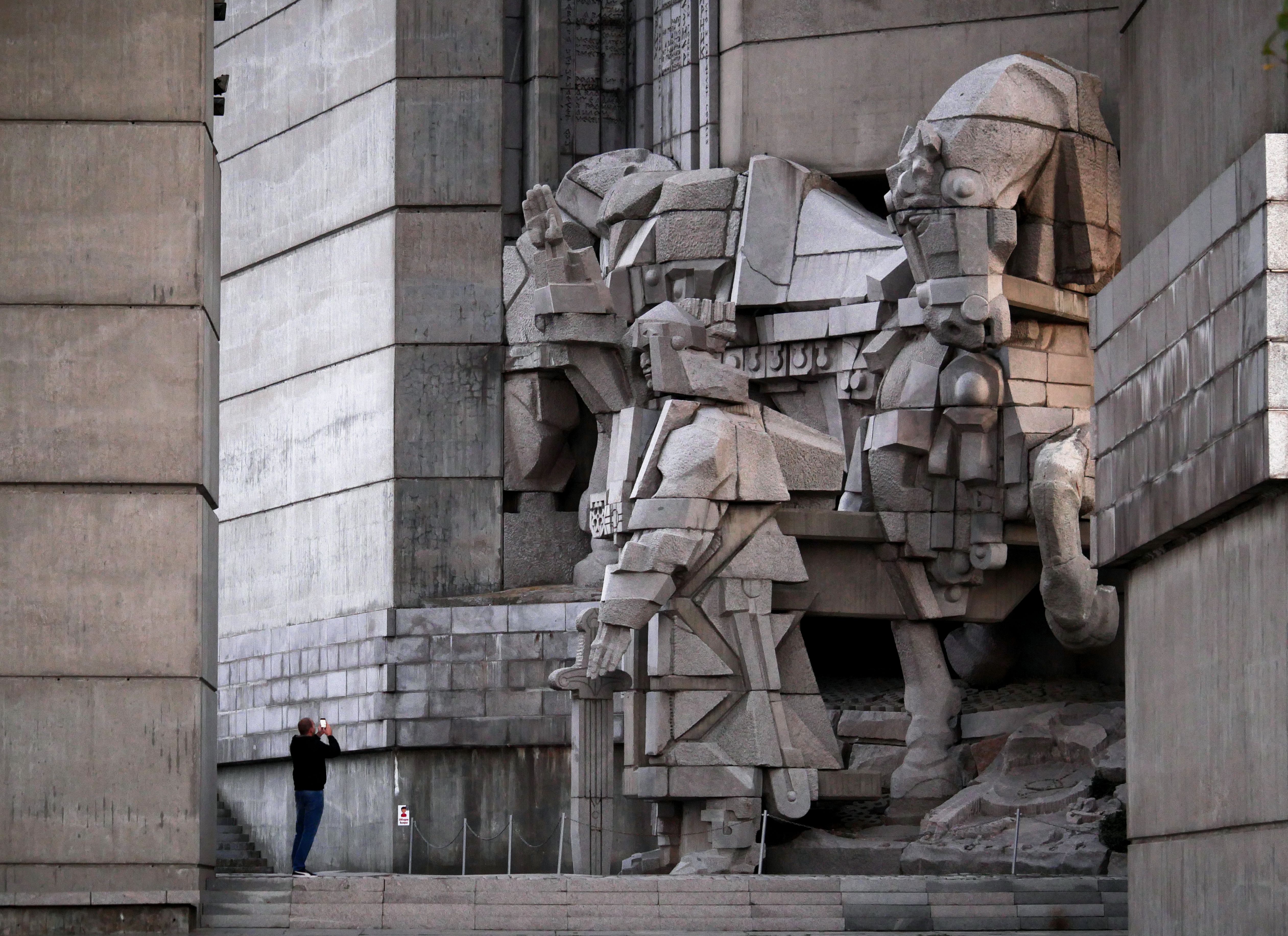 Массивный бетонный лев (вверху справа) забрался на вершину монумента. Это памятник основателям Болгарского государства, поставленный в 1981 году в честь 1300-летия болгарской государственности. Рядом с ним старинный болгарский город Шумен.