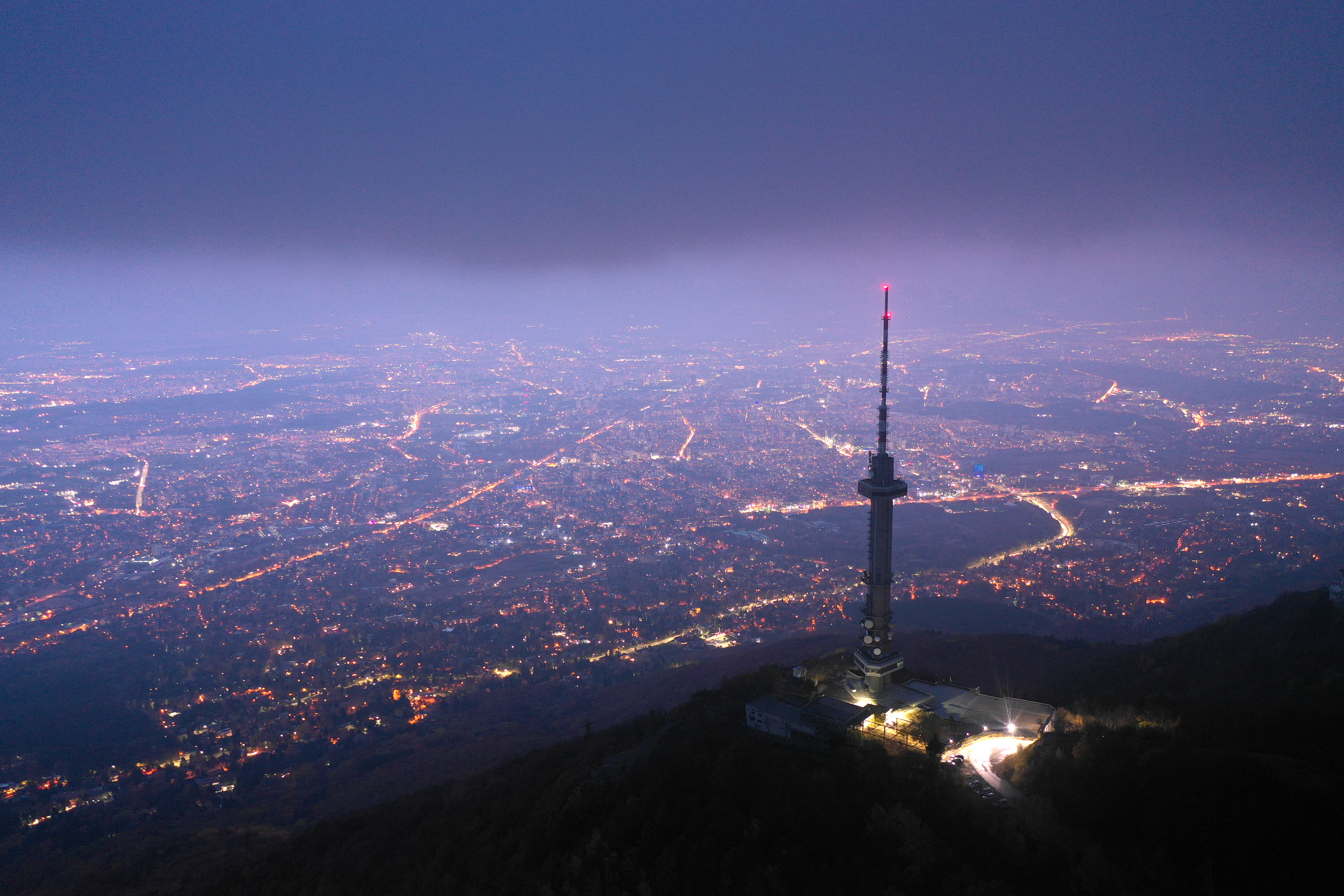 Телебашня на горе Витоша. У подножия горы мерцает огнями вечерняя София.