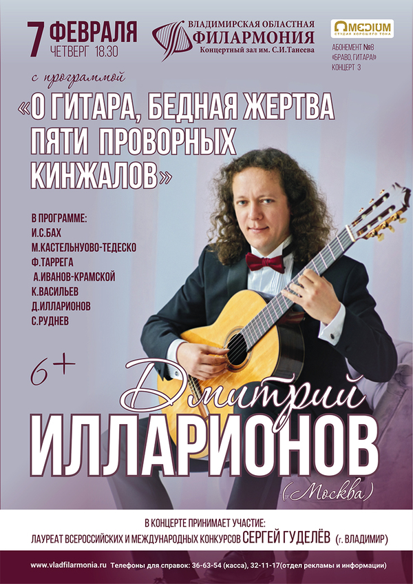 Дмитрий Илларионов – импровизатор, композитор, аранжировщик, дирижёр, педагог, организатор крупнейших гитарных фестивалей в России, член жюри международных конкурсов и даже киноактёр, но в первую очередь – классический гитарист, обладающий грандиозным репертуаром. Он один из самых титулованных гитаристов в мире, обладатель первых премий самых престижных мировых конкурсов гитары, среди них: гран-при конкурса Гитарной ассоциации Америки в США и первые премии на конкурсах им. Тарреги и им.Сеговии (Испания). Доцент Российской академии имени Гнесиных. Номинант лонг-листа премии “Grammy”. Дмитрия Илларионова знают во всем мире. Его называют музыкантом экстра-класса, хвалят за филигранную технику и глубокую эмоциональность.
