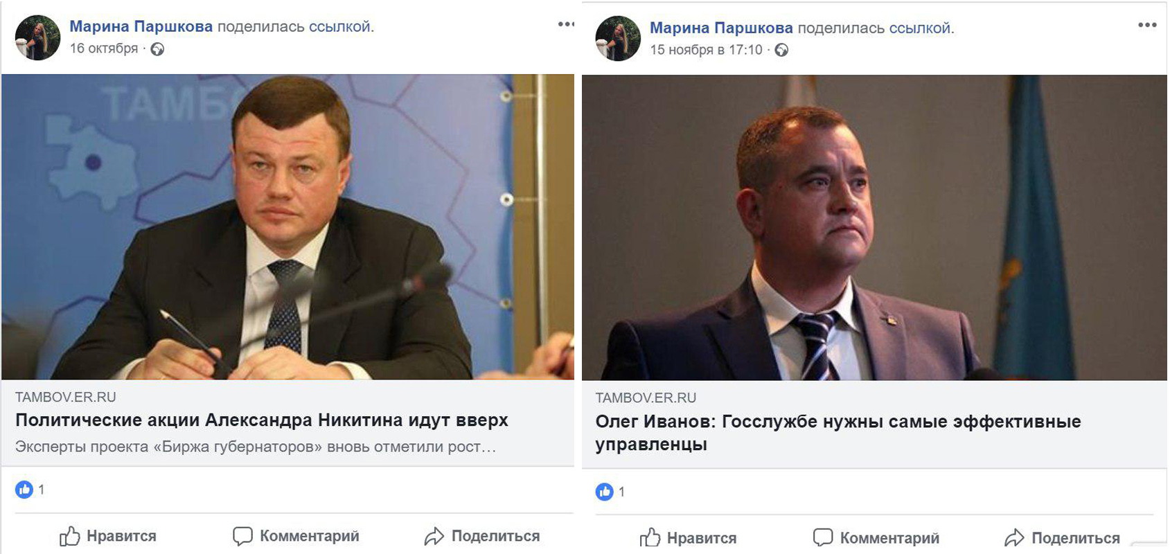 — Именно там. Марина Михайловна Паршкова — консультант в управлении регионального развития и поддержки инвестиционной деятельности отдела инноваций и развития малого и среднего предпринимательства Администрации Тамбовской области. У себя в фейсбуке она регулярно публикует фотографии губернатора Никитина и вице-губернатора Иванова.