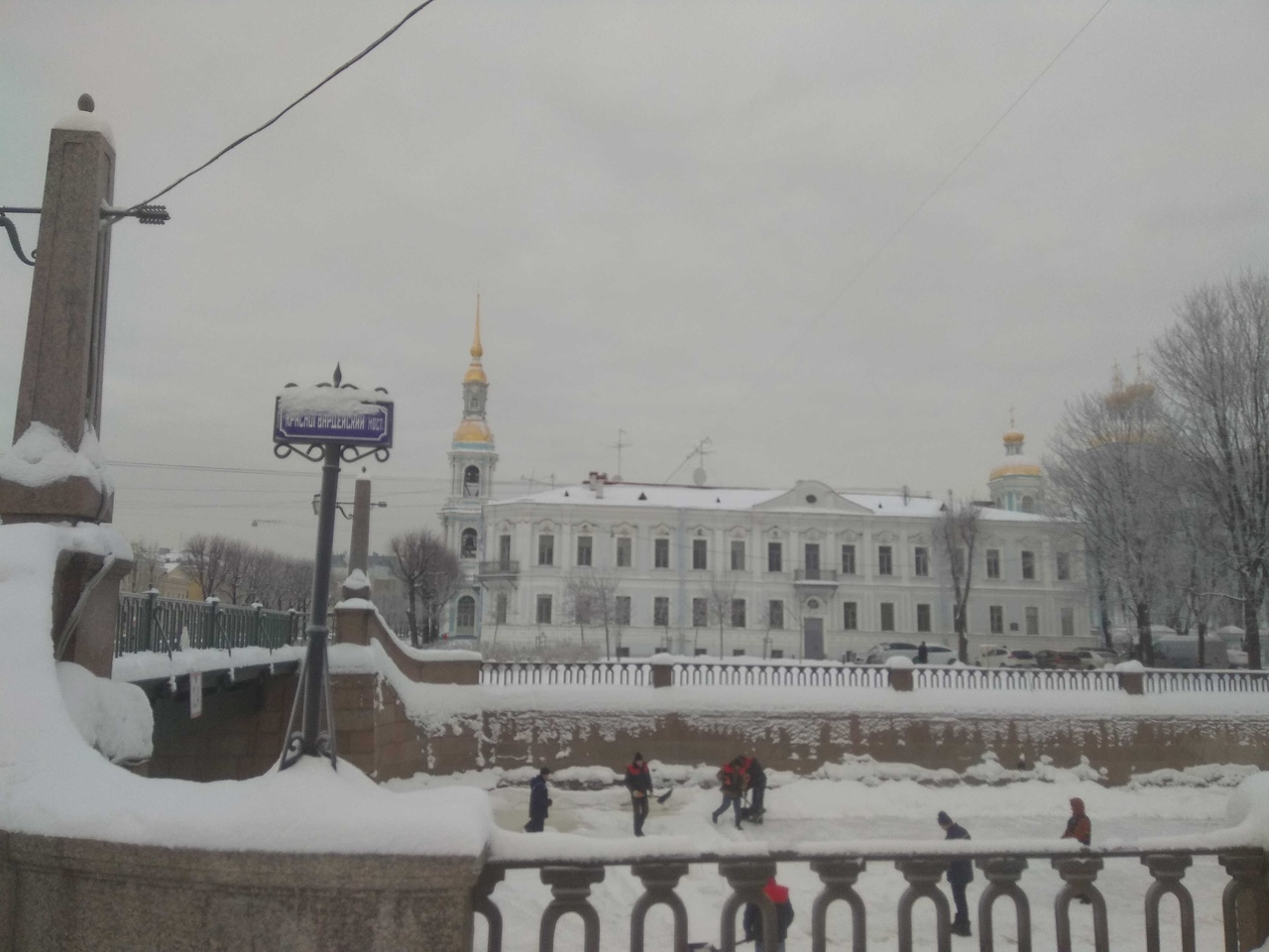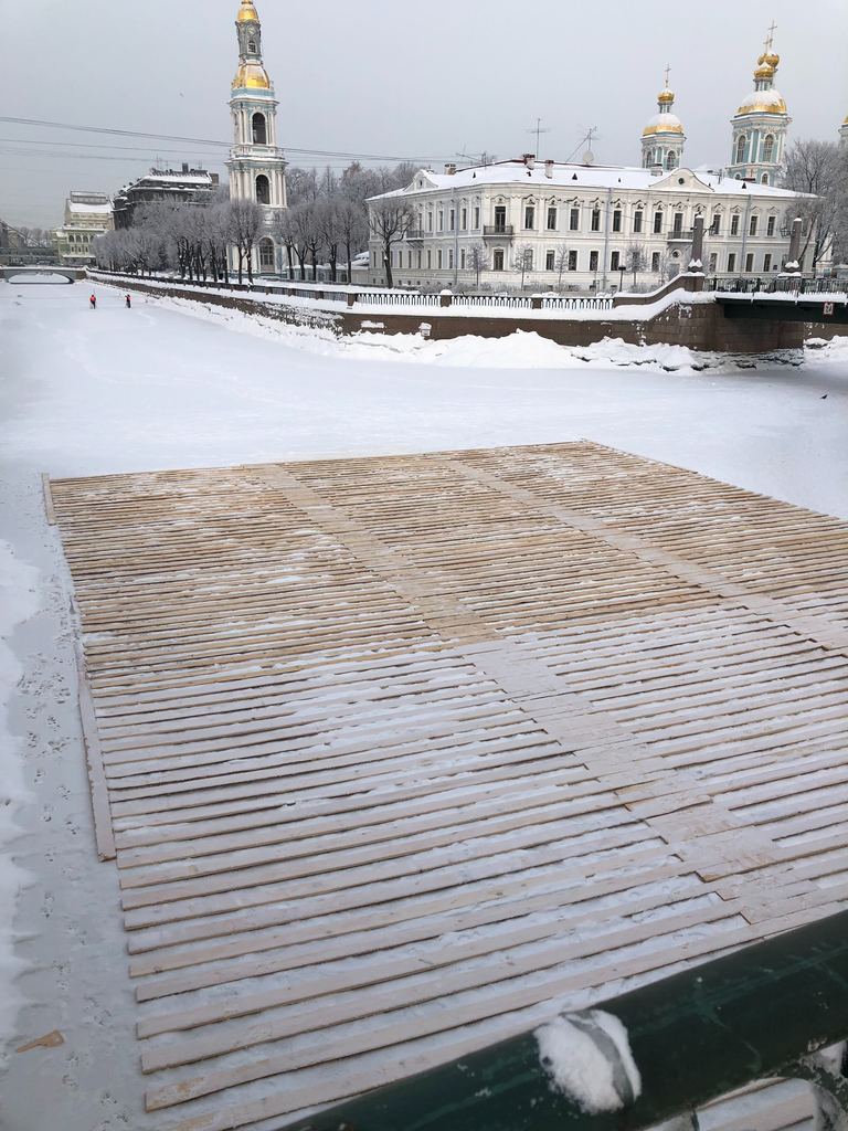 Днем 25 января местные жители заметили, что рабочие подметают поверхность Крюкова канала и канала Грибоедова. На убранную площадь сейчас и укладывают доски.