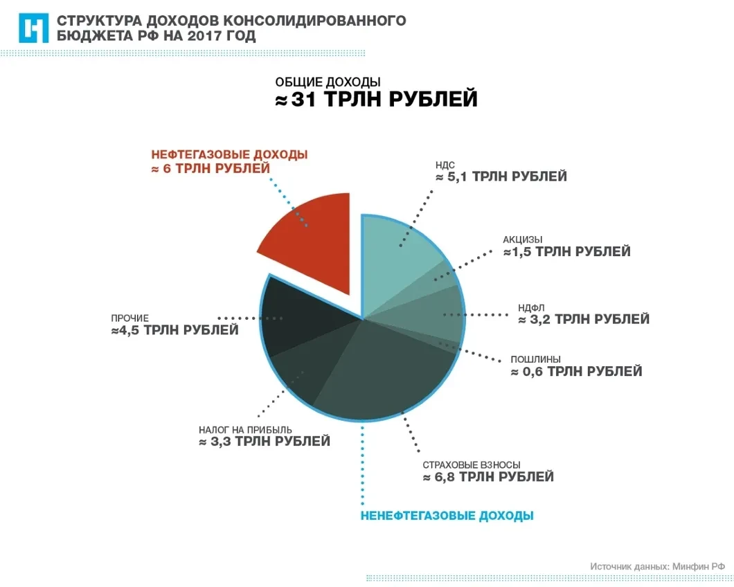 При спорах о том, откуда у государства берутся деньги, важно учитывать все уровни бюджетной системы. В консолидированном бюджете за 2017 год (включает в себя федеральный бюджет, региональные бюджеты и взносы на обязательное социальное страхование) доля нефтегазовых доходов составила менее 20%. Этот показатель варьируется в зависимости от мировой конъюнктуры: как только цены на нефть падают, снижается и доля сырьевых доходов бюджета.