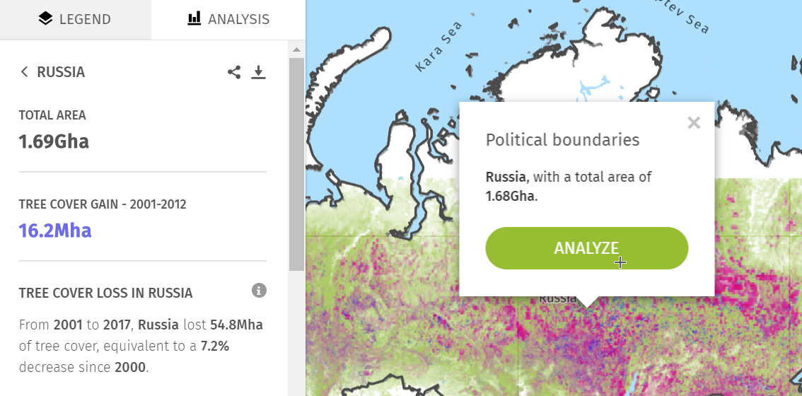 С помощью этого сервиса, например, можно узнать, что с 2001 по 2017 год Россия потеряла 54,8 млн га древесного покрова, что на 7,2% меньше, чем в 2000 году. Наиболее сильная потеря древесного покрова наблюдается в Бурятии: 16% по сравнению со средним по стране показателем 4,3%.