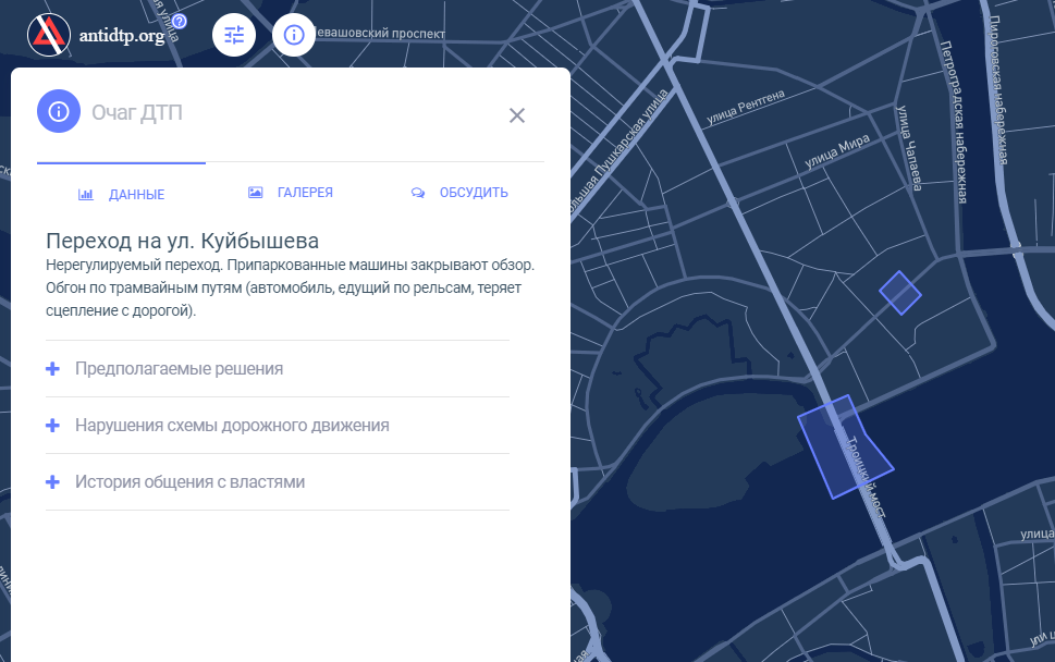 Современные технологии позволяют создать более комфортные и безопасные условия для жизни. Теплица уже писала про петербургский проект АнтиДТП, ставший победителем хакатона Теплицы в 2018 году. Сервис позволяет выявлять очаги ДТП, координироваться местным жителям и экспертам, вырабатывать аргументированные запросы на изменение схем дорожного движения на конкретных участках.