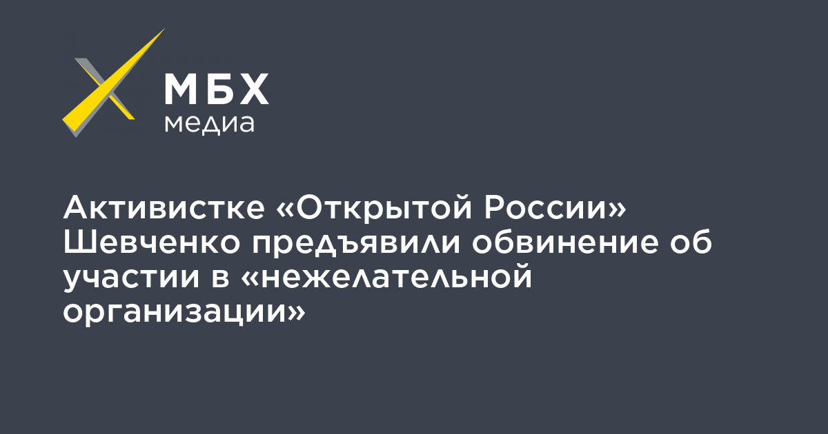 Активистке «Открытой России» Анастасии Шевченко предъявили обвинение по статье об осуществлении деятельности организации, признанной нежелательной в России (284.1 УК), об этом «МБХ медиа» сообщил координатор «Правозащиты Открытки» Алексей Прянишников.