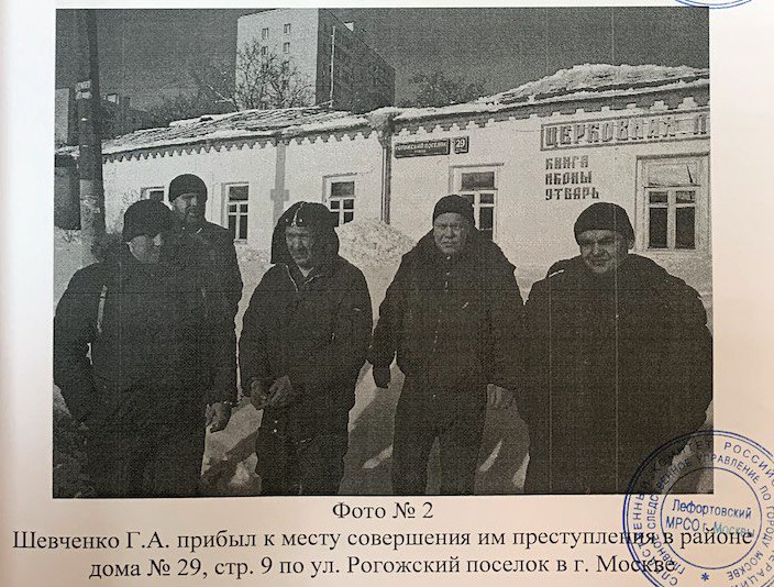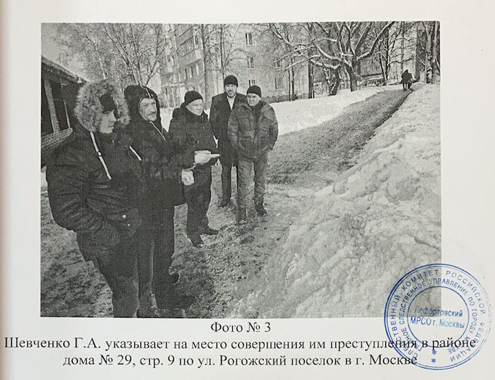 Когда уже стемнело, трое незнакомых оперативников повезли Георгия к месту убийства — Шевченко говорит, что тогда он впервые и побывал на улице Рогожский поселок. Ему доходчиво объяснили, что надо говорить при проверке показаний на месте: он пришел к поляне со стороны Нижегородской улицы, напал на Сухоребрикова и убежал обратно в сторону Нижегородской.