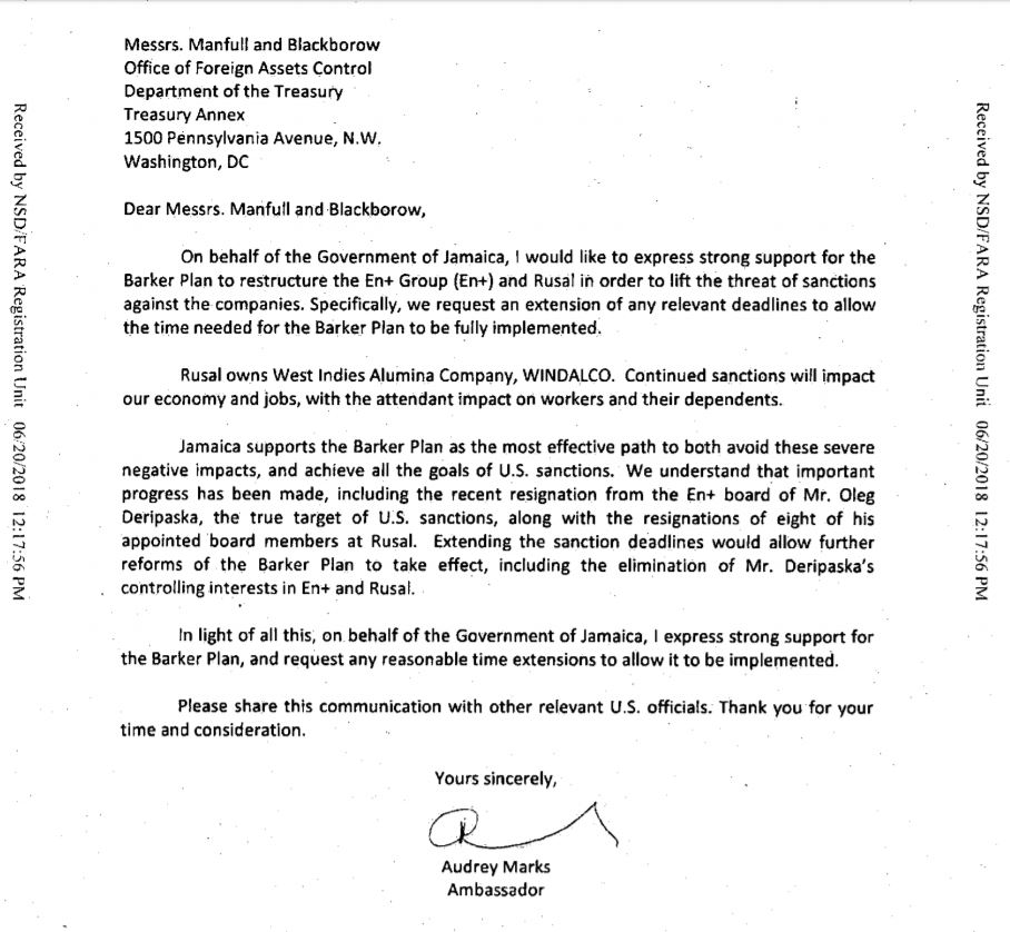 На Ямайке UC Rusal владеет компанией WINDALCO (West Indies Alumina Company), поэтому «сохранение санкций негативно скажется на экономике, рабочих местах, а также на самих рабочих и тех, кто зависит от них финансово», написал в Конгресс посол страны в США.