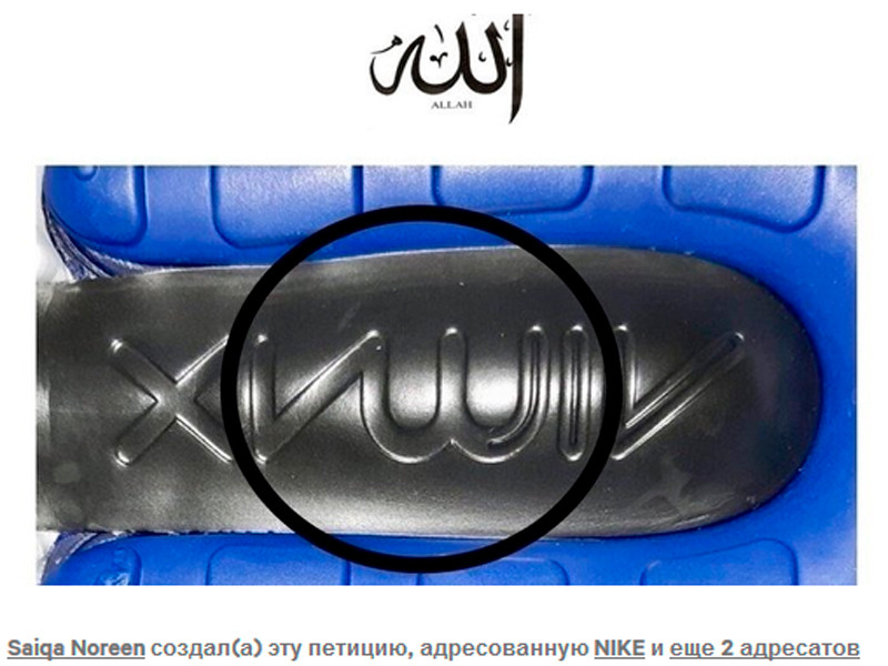 На портале Change.org набирает популярность петиция, призывающая компанию Nike и ее генерального директора Марка Паркера отозвать из продажи партию кроссовок Air Max 270. Создатель петиции - жительница Великобритании Сайка Норин указывает, что на подошве этой модели кроссовок размещен стилизованный логотип, который напоминает написанное по-арабски слово "Аллах".