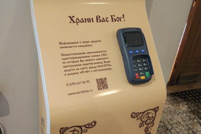 На стенде с изображением храма и надписью «Храни Вас Бог!» установили терминал для банковских карт. С его помощью можно сделать пожертвования в благотворительный фонда WorldVita.