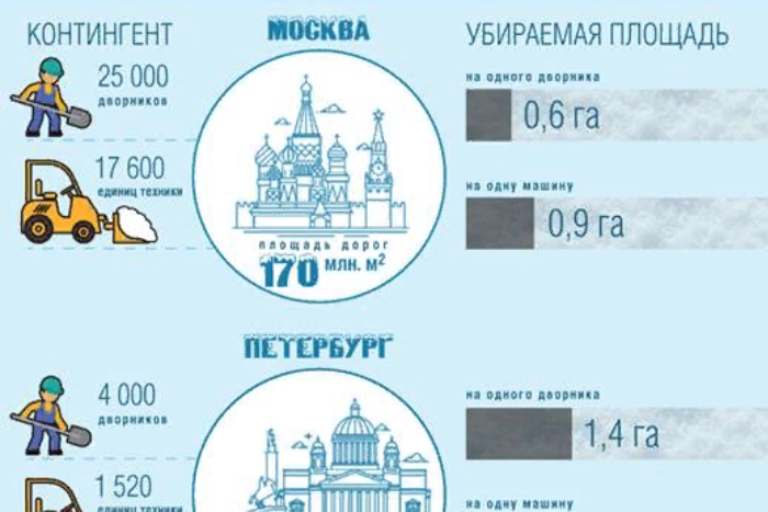 Петербургский журналист Илья Казаков в инфографике сравнил уборку снега в Петербурге, Москве, Екатеринбурге и Казани. В качестве основного критерия он взял размер территории, которая приходится на одного дворника и одну единицу спецтехники.