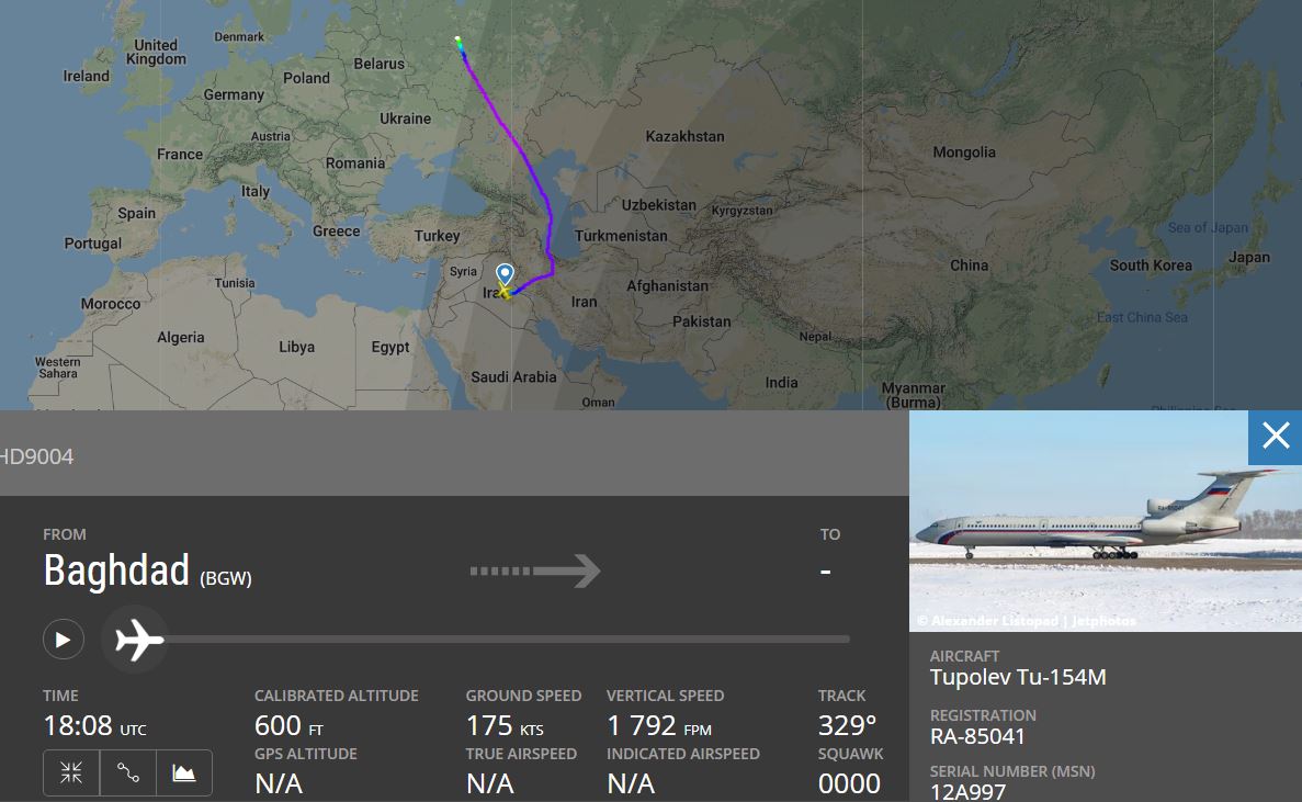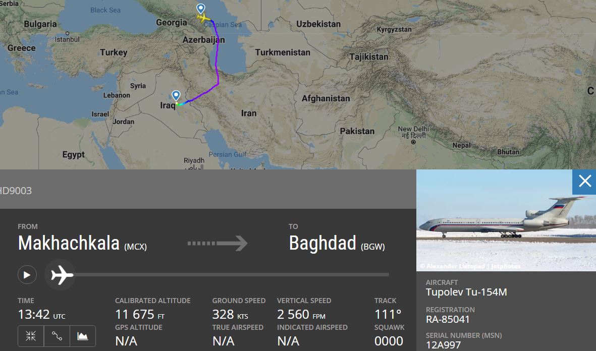 Интересно, что через два дня после возвращения из Банги, 31 августа, этот же борт номер RA-85041 отправился по маршруту Махачкала – Багдад – Москва. Это единственный случай за 2018 год, когда самолеты RA-85041 и RA-85155 посещали столицу Ирака, возможное объяснение состоит в том, что военные направлялись на самом деле в Латакию, но самолет был перехвачен ВВС Ирака. Во всяком случае, в тот же день портал Al Masdar News сообщил, что иракские власти запретили пройти через воздушное пространство страны самолету Ту-154М, летевшему из Москвы в провинцию Латакия на западе Сирии. Посольство Ирака в Москве тогда заявило, что "новость сфабрикована" и является попыткой "повлиять на отношения России и Ирака". Данные FlightRadar свидетельствуют об обратном: самолет действительно был вынужден сесть в Багдаде, а потом отправился не в Латакию, а обратно в Россию.