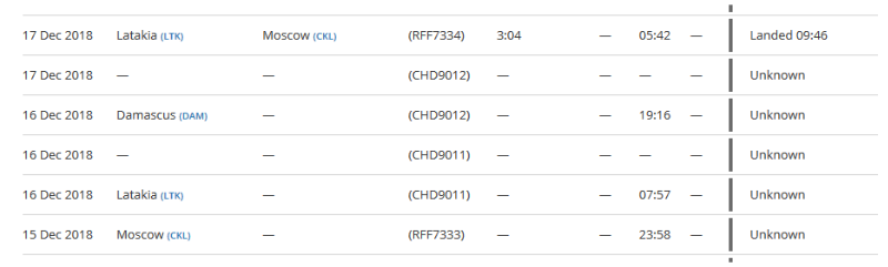 Наконец, последний на сегодняшний день, девятый рейс RA-85155 оказался самым интересным. Борт вылетел из Москвы незадолго до полуночи 15 декабря, через Латакию добрался до Хартума, но оттуда утром 16 декабря не в Латакию, а направился в столицу Сирии Дамаск. Этот маршрут соотносится с визитом президента Судана Омара аль-Башира в Дамаск к Башару Асаду, который состоялся как раз 16 декабря. На одной из совместных фотографий, сделанных в ходе визита, Асад и аль-Башир стоят на фоне самолета с полосками в цветах российского флага, детали фюзеляжа напоминают Ту-154, по всей видимости, это и есть борт RA-85155. Вечером 16 декабря российский самолет из Дамаска вновь направился в Хартум, вероятно, чтобы доставить домой суданского визитера, и из Хартума через Латакию вернулся в Москву.