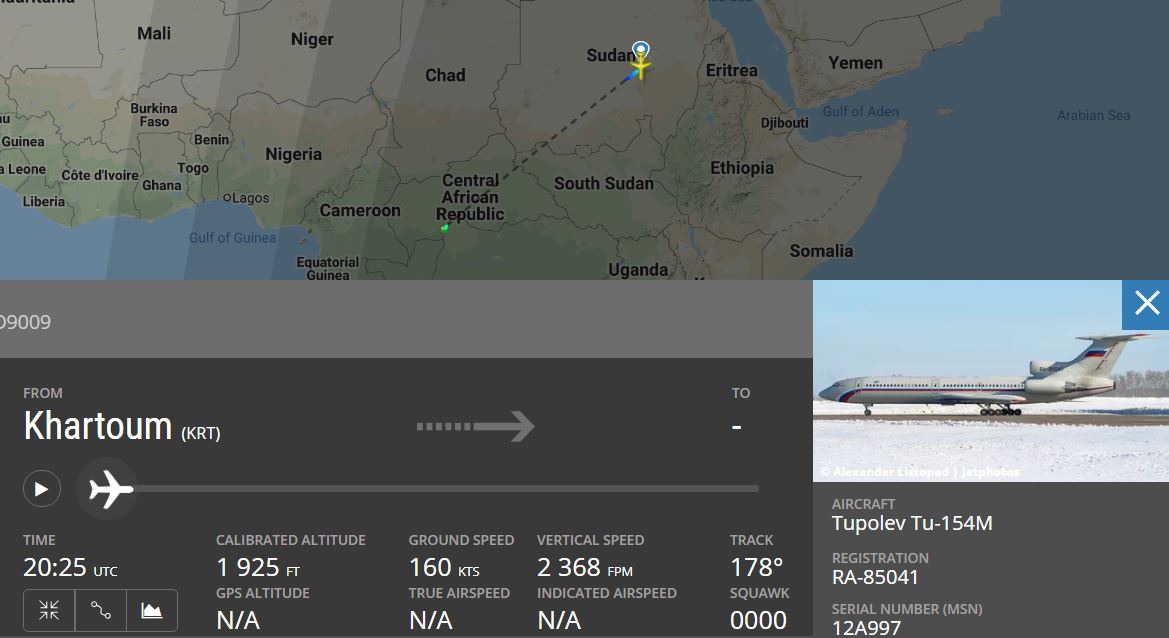 Первый из этих полетов начался 4 августа в Москве по тому же маршруту, которым летел разбившийся в декабре 2016 года Ту-154 с ансамблем Александрова и Елизаветой Глинкой на борту (тот борт принадлежал тому же 223-му летному отряду МО РФ): через Сочи в Латакию. Однако, пробыв на базе Хмеймим совсем недолго, борт RA-85155 взял Курс на Хартум. В столице Судана самолет провел почти целый день 5 августа, и в ночь на 6-е число вылетел тем же маршрутом через Латакию и Сочи в Москву.