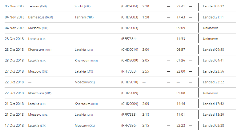 Четвертый полет – начало октября. Примечательно, что рейс, начавшийся 1 октября в Чкаловском, по данным FlightRadar24, изначально направлялся в Симферополь, но уже в полете был переназначен на Латакию. Далее вновь Хартум (стоянка 2 октября около 15 часов) и обратно в Москву через Латакию.
