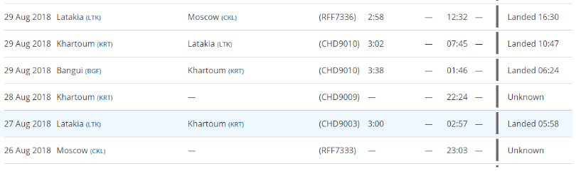 Радио Свобода удалось по данным сервиса FlightRadar24 установить, что самолеты 223-го летного отряда Министерства обороны РФ как минимум начиная с августа 2018 года регулярно посещали Хартум (Судан) и по одному разу Бенгази (Ливия) и Банги (Центральноафриканская Республика). Все полеты совершались с посадкой на военной базе Хмеймим в сирийской Латакии, где базируются российские воздушно-космические силы (ВКС). Данные FlightRadar24 независимо подтверждаются договорами, которые 223-й летный отряд заключил на обеспечение и обслуживание этих перелетов с коммерческими подрядчиками (подробнее об этих контрактах в следующей главе). Кроме того, некоторые из маршрутов можно сопоставить с конкретными событиями на Ближнем Востоке.