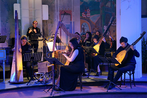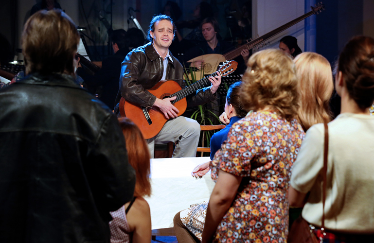 © Елена Лапина Теперь, спустя 10 лет, режиссер обратился к этому сочинению вновь — уже гораздо более оснащенный наступившей эпохой исторического информирования (хотя дирижера Валерия Платонова он взял из прежней, пермской, жизни). Большой друг театра — барочник Эндрю Лоуренс-Кинг — снова в центре группы инструменталистов, стильно украшенной теорбами и сакбутами. Сам Лоуренс-Кинг, значащийся в постановочной команде консультантом по барочному стилю, играет попеременно на барочной арфе, клавесине и уникальном маленьком клавишном инструменте под названием «регаль», как и в старину, издающем невероятно мерзкие звуки ада. К старательному, но ученическому музицированию всех остальных участников представления знаменитый арфист добавляет воздуха, свободы и пластичности.