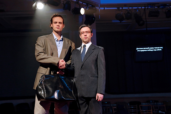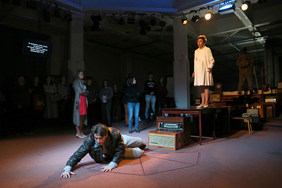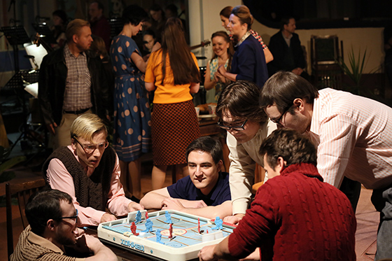 © Елена Лапина Основной зал в спектакле не задействован. Исаакян указал художнице на святая святых своего театра — верхнюю ротонду, где всегда была огромная клетка с птицами. Птиц отселили, в ротонде кругом поставили два ряда разномастных, видавших виды стульев для публики (ее помещается всего 40 человек). По барахолкам насобирали полированных столов, радиол, пузатых телевизоров и прочих артефактов à la Kabakov. Хор и солистов приодели в платья и клеши из бабушкиных сундуков (собиратель костюмов — Алексей Лобанов). В руки Орфею (в моем спектакле это был Андрей Юрковский) дали каэспэшную гитару, суровому Харону (Олег Банковский) вместо лодки нашли аутентичные советские лыжи с палками. По затемненному фойе зрители проходят сквозь двери унылого канцелярского шкафа (специальная тетенька предупреждает: «Осторожно, ступенька, берегите голову») мимо цветов в горшках из поликлиники и рожковой люстры над журнальным столиком. Поднявшись в ротонду, они попадают сначала на веселую студенческую свадьбу с гранеными стаканами и настольными играми, потом — в душноватый морок официальных награждений и смирной хоровой самодеятельности. Между этими двумя состояниями — главный трюк спектакля: в бездну ада можно попасть, спрыгнув с перил ротонды на предательски пыхтящий с нижнего этажа батут. Помимо Орфея это проделывает еще целая поминальная вереница грустных, придирчиво одетых советских граждан, кажется, выходящих прямо из рядов зрителей (которым в этот момент положено стоять), давая постановщикам повод для дополнительного винтажного дефиле.