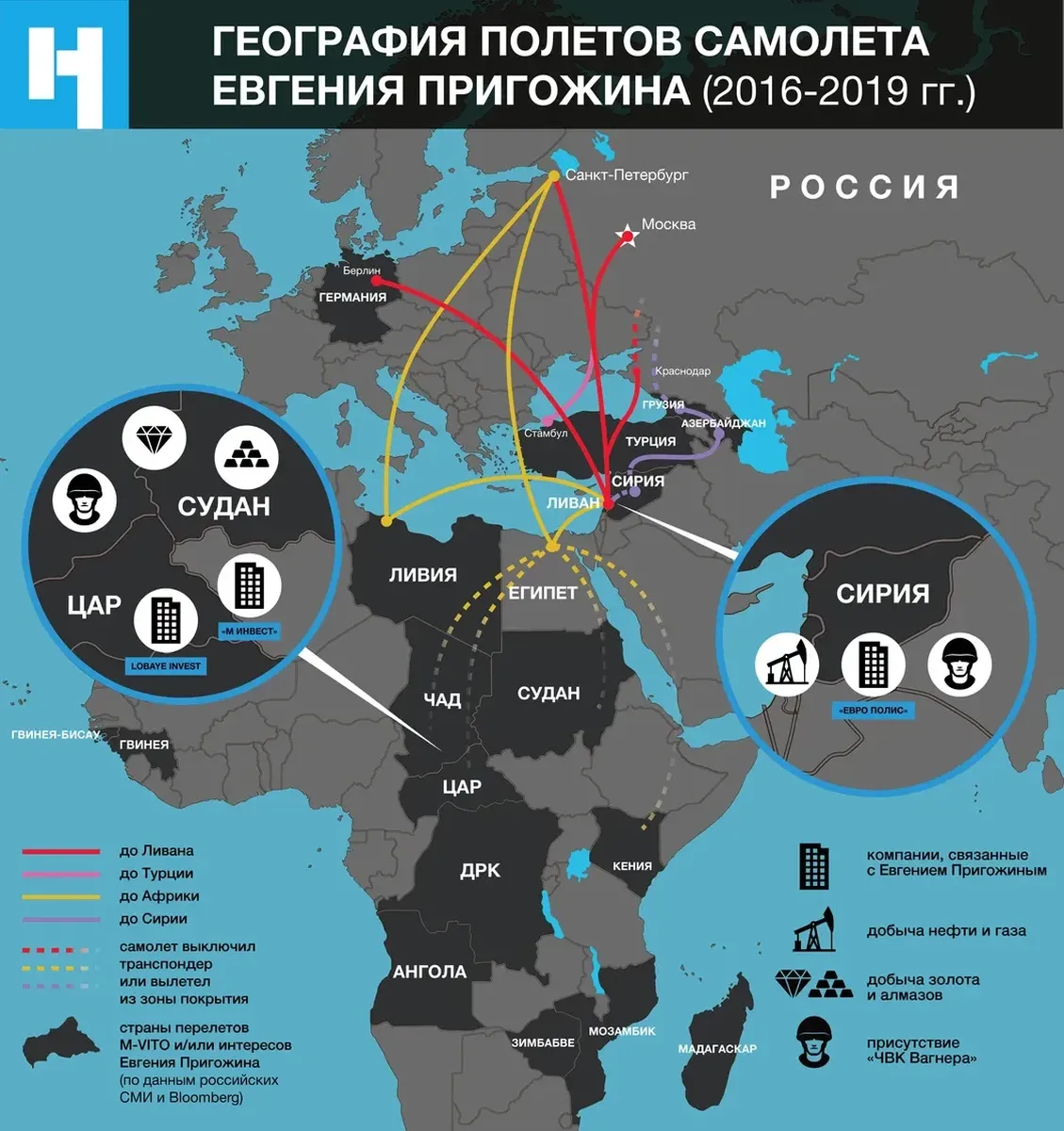 С чем бы ни связывали имя Евгения Пригожина, — с «фабрикой троллей», вмешательством в выборы США, «ЧВК Вагнера», добычей нефти, газа и золота, — за ним прочно закрепилось звание «кремлевского повара». «Новая газета» совместно с Центром по изучению коррупции и оргпреступности (OCCRP) посмотрела, куда летает самолет Пригожина, и выяснила, что уже долгое время он, как по расписанию, перемещается в Африку и на Ближний Восток. Что готовит предприниматель, занимающийся обычным кейтерингом, в зонах вооруженных конфликтов по всему миру?
