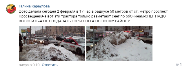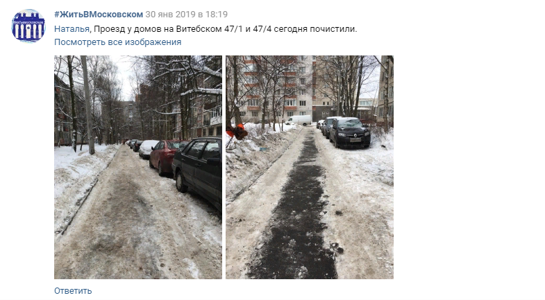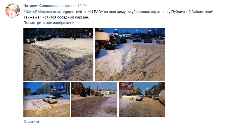 А в группе Московского района для жалоб на уборку снега завели специальное обсуждение. Но администрация отвечает нерегулярно, а в обсуждении появляются новые фотографии заснеженных улиц.