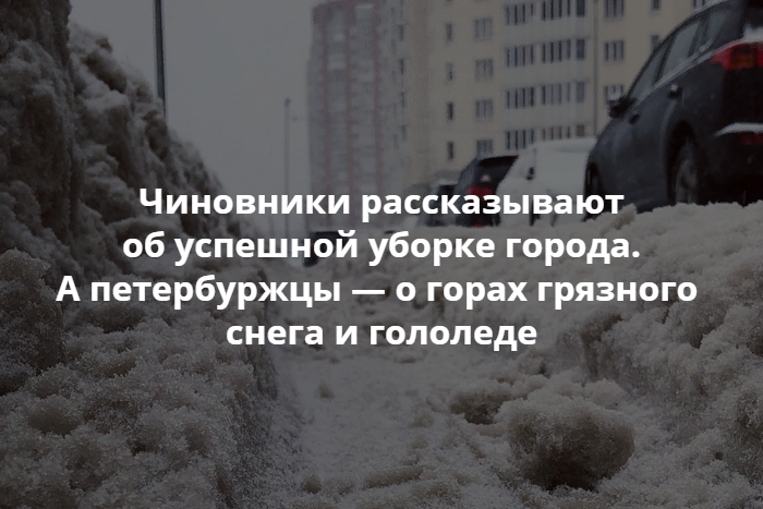 В Смольном связывают долгую уборку со «сверхнормативными осадками». Районные администрации отчитываются об очистке территории, но люди продолжают сообщать, что по Петербургу невозможно передвигаться. «Бумага» сравнила, что об уборке говорят чиновники и горожане.