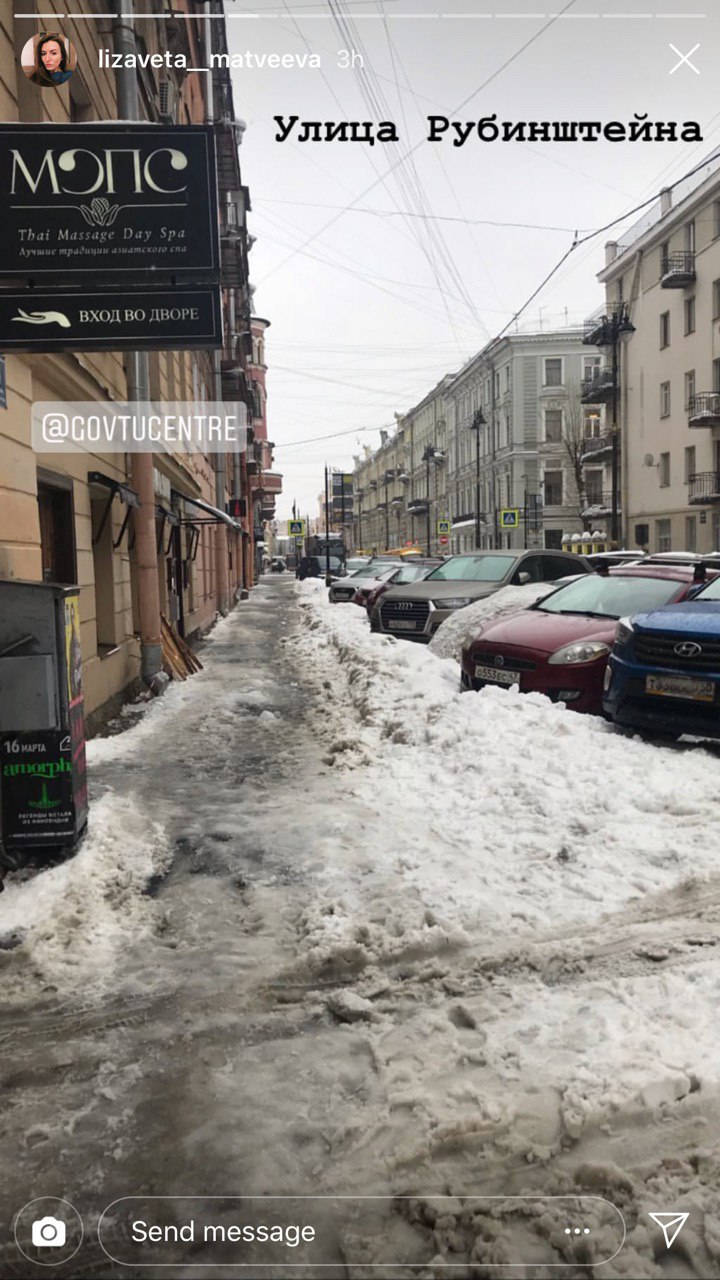 Снегопады в Петербурге продолжаются с конца декабря, горожане постоянно жалуются на плохую уборку. Кучи грязного снега на обочинах и тротуарах, не обработанная песком или гранитной крошкой наледь, огромные сосульки и лужи — всё это наблюдают на улицах города уже больше месяца. Пешеходы из-за плохой уборки получают травмы: например, иностранная туристка сломала ногу, поскользнувшись на остановке возле Эрмитажа.