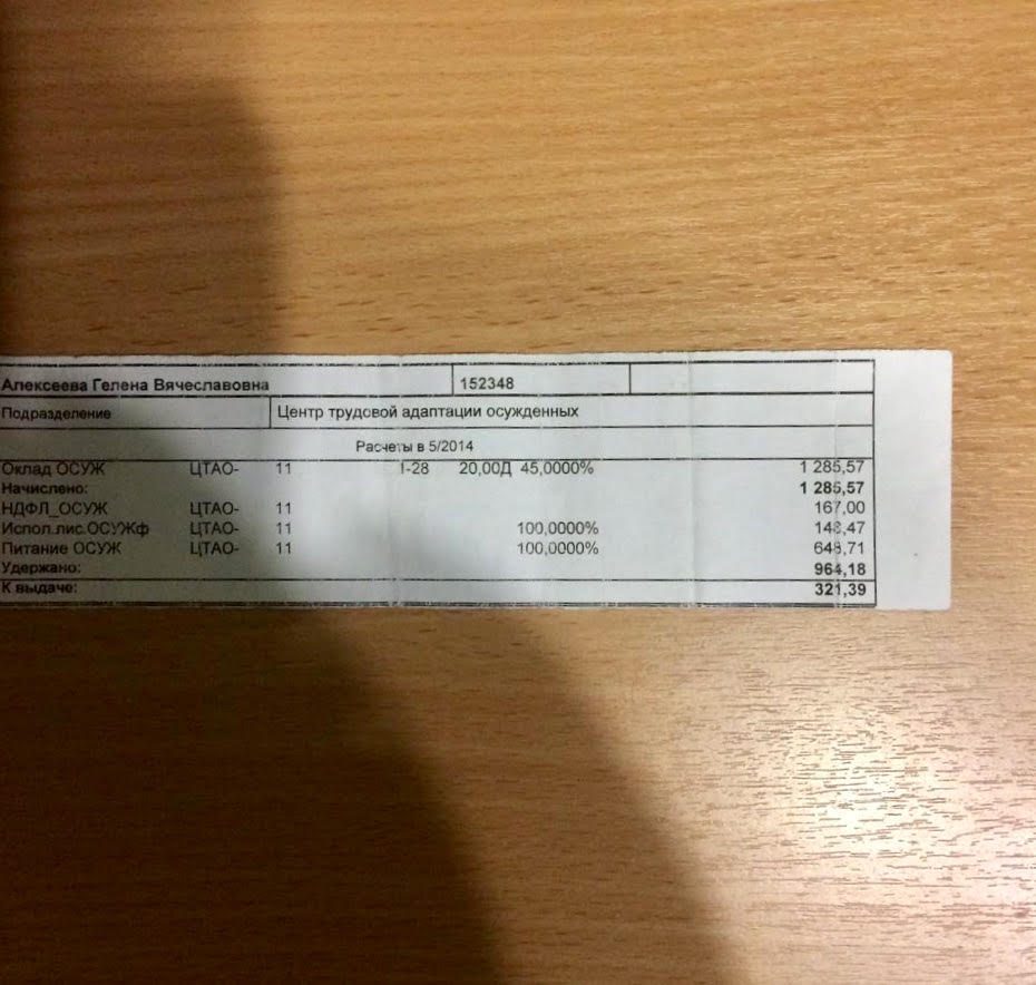 Допустим, кому-то нужно поставить меньше: в этом случае зарплаты были и 50, и 60 рублей, и 300–400. Дальше есть общие начисления. И колония начинает снимать: за "великолепную" форму одежды – столько-то процентов, в счет погашения – столько-то процентов. И у меня остается 300 рублей, они "падают" на мою карточку. Это меня сильно удивило. Начисления зарплаты происходит именно так. Как они придумали, так они и выплатят.