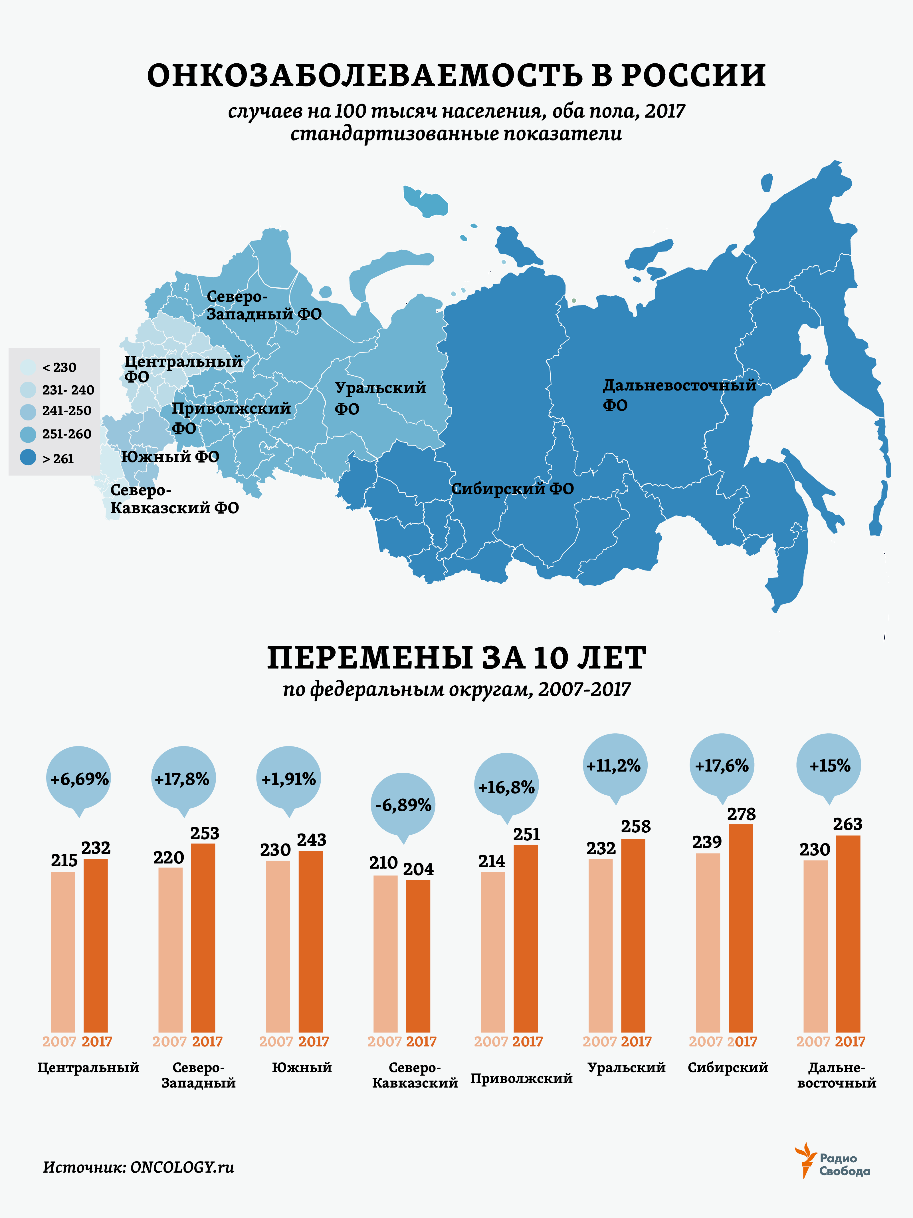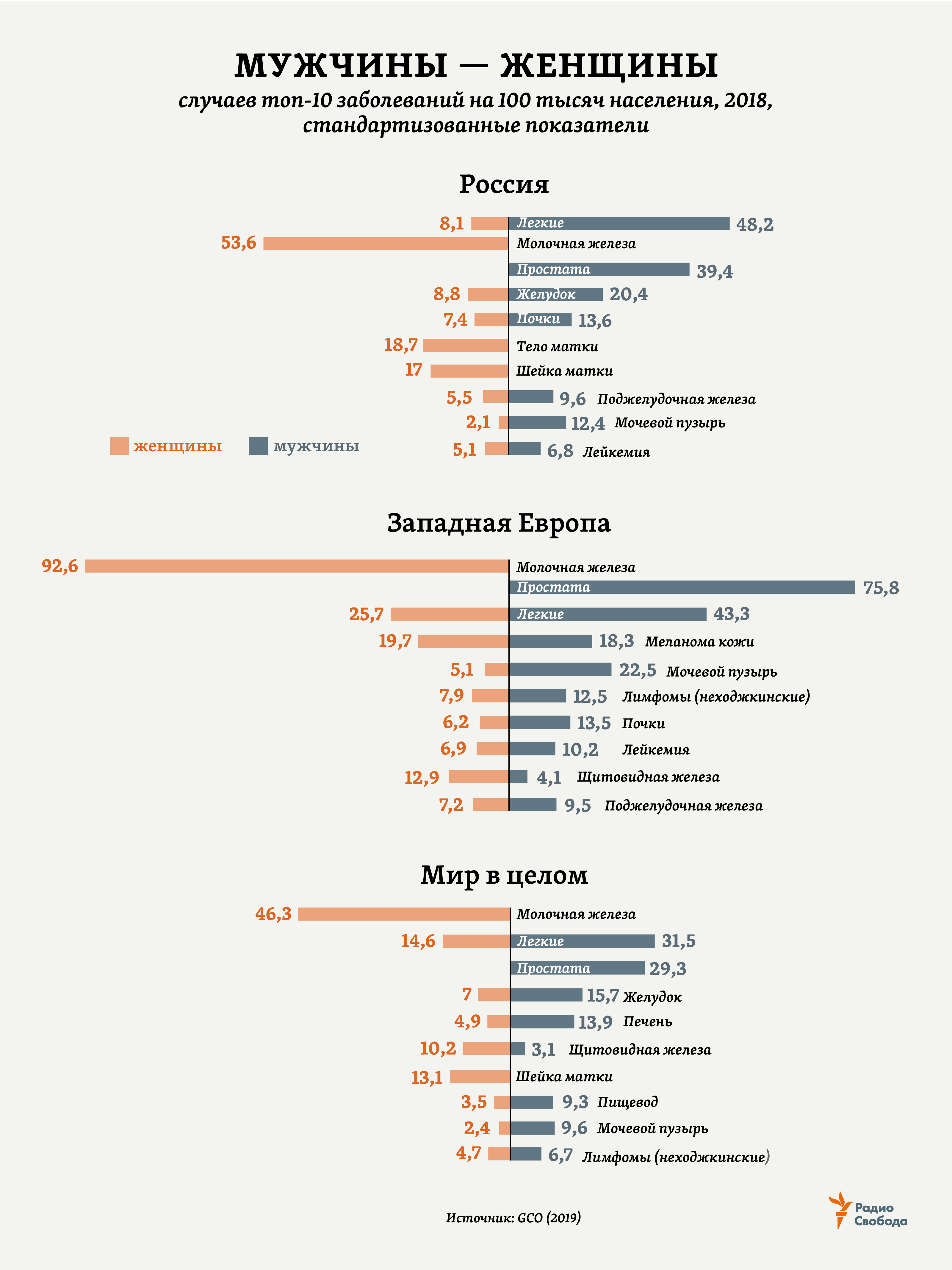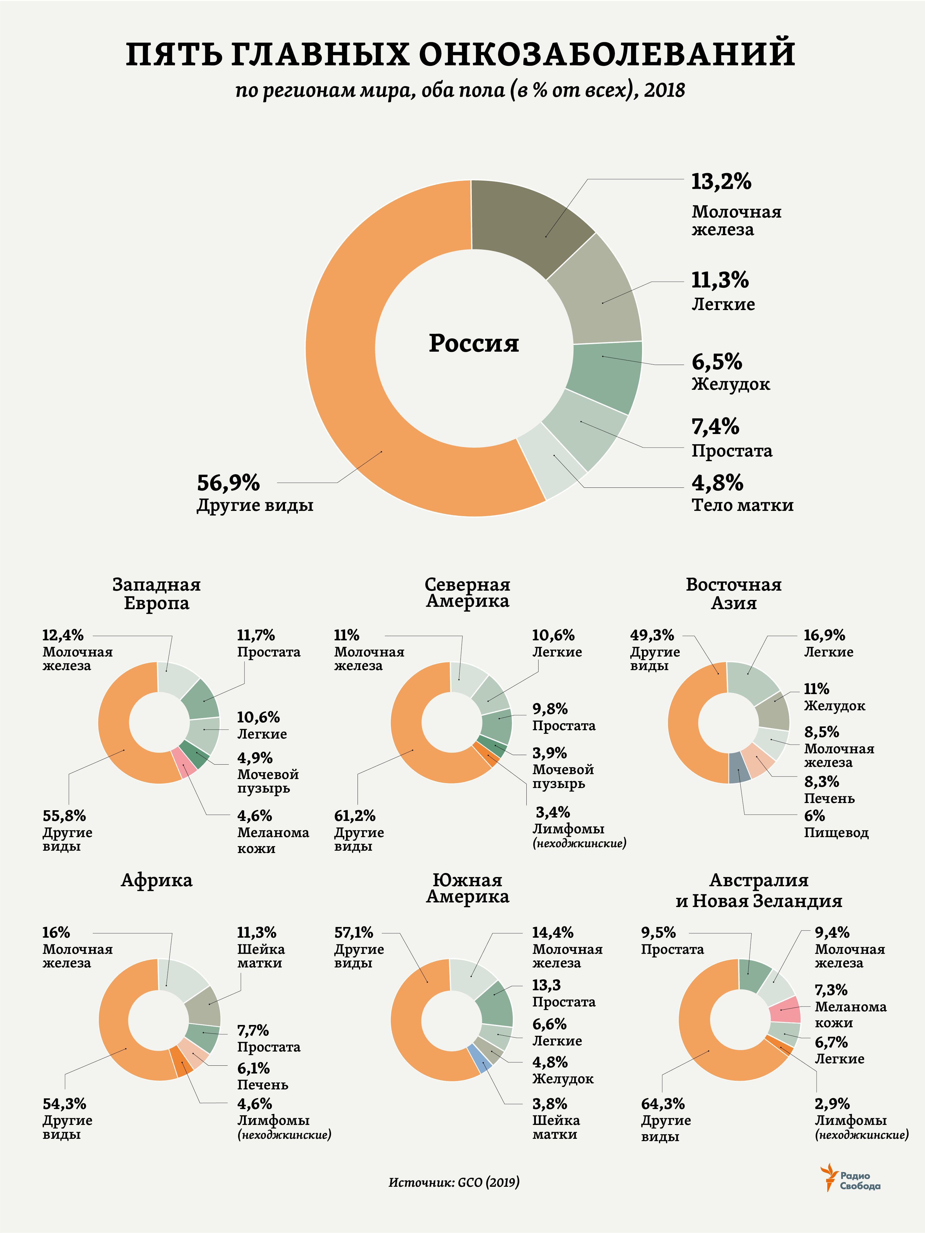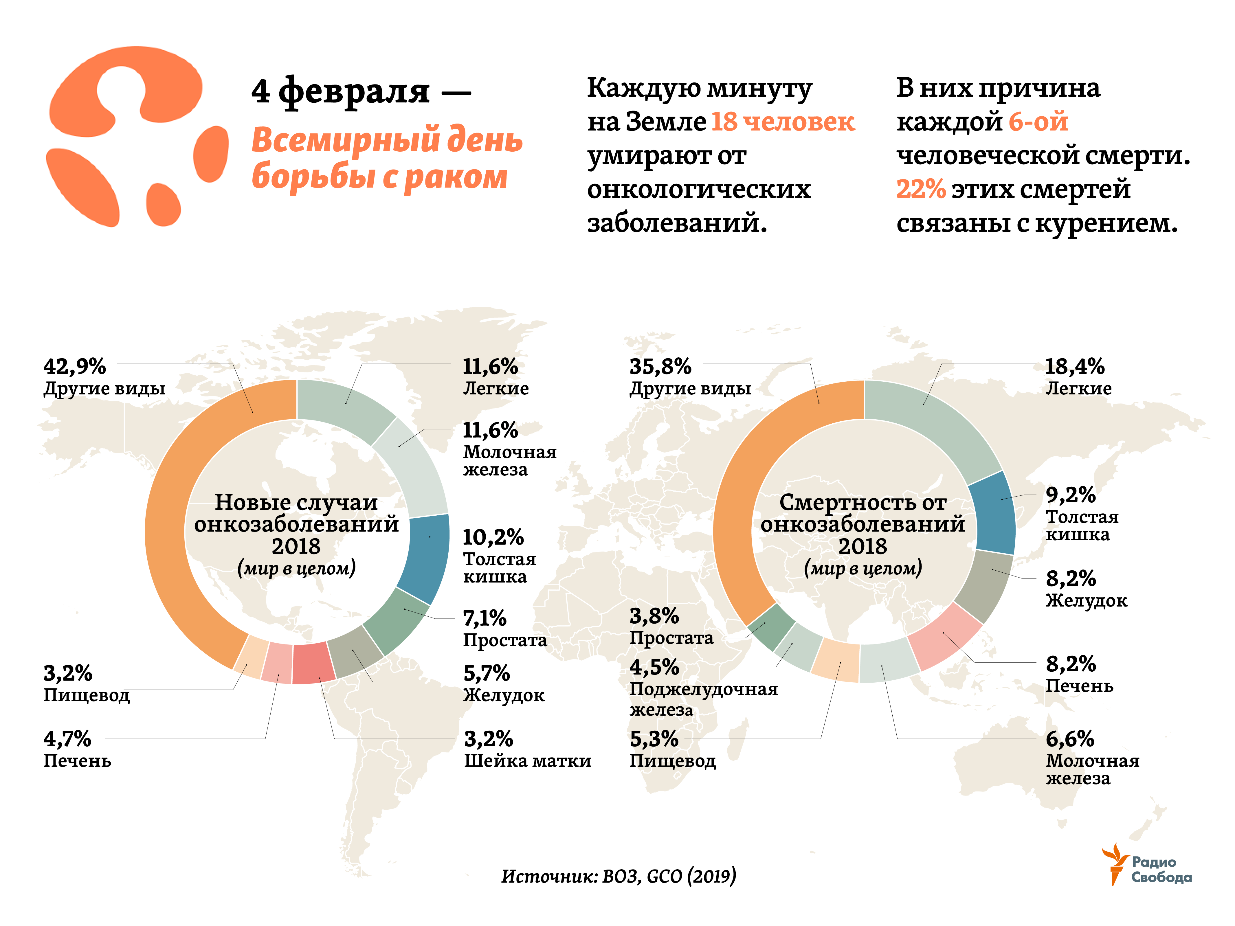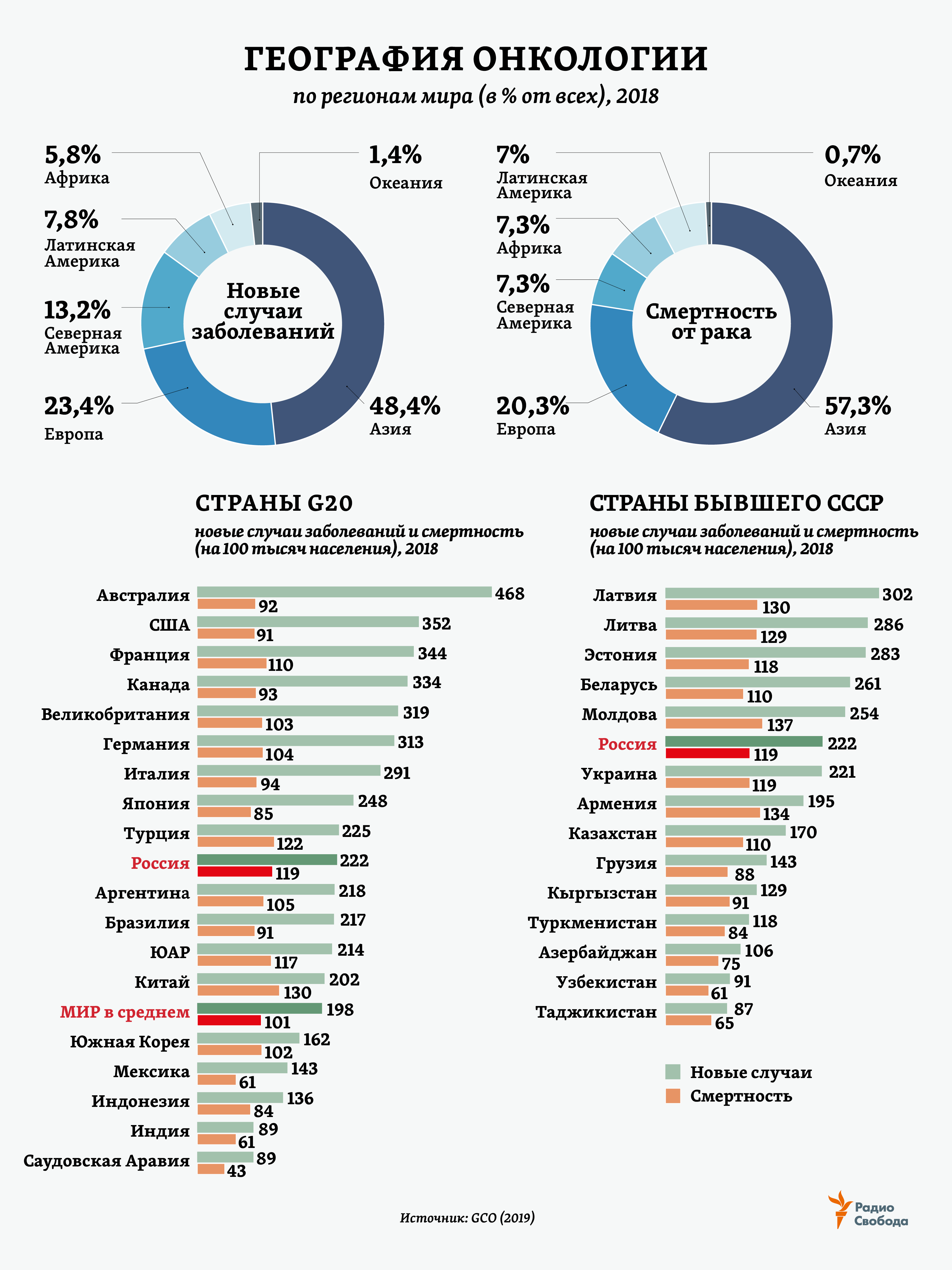 Раковые заболевания считаются второй из основных причин смерти в мире. В 2018 году от онкологии, согласно данным Всемирной организации здравоохранения (ВОЗ), умерли 9,6 миллиона человек. Россия находится на пятом месте по числу смертей от раковых заболеваний. Еще хуже дело обстоит в Китае, Индии, США и Японии. Меньше всего от рака умирают в Новой Зеландии. Все эти данные представлены в материале проекта Русской службы Радио Свобода "Фактограф".