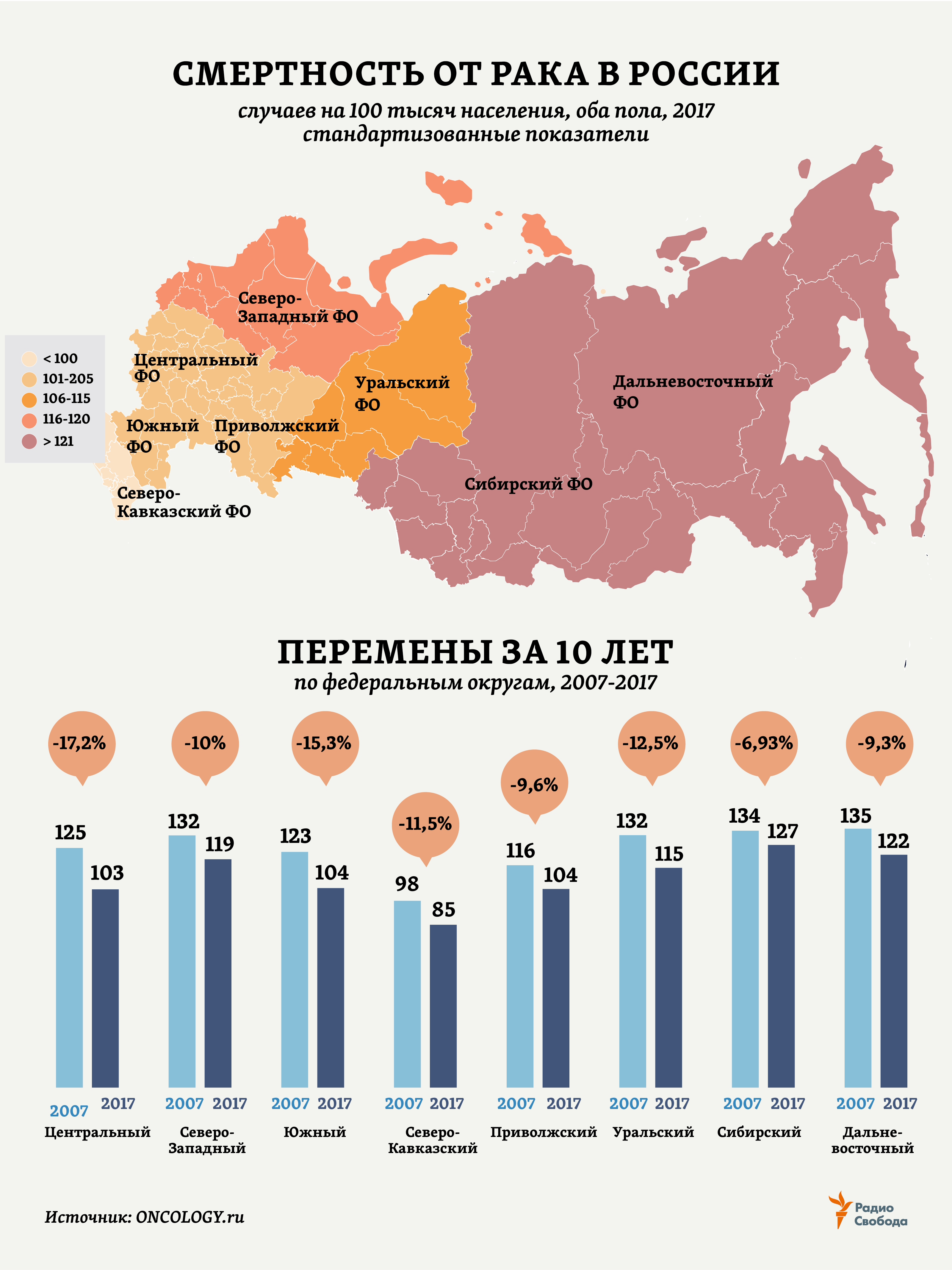 "Пациенты стали умирать реже, и связано это с разными причинами. Во-первых, люди в принципе стали меньше болеть раком. Во-вторых, уровень оказания онкологической помощи стал значительно выше", – рассказал Радио Свобода научный сотрудник Научно-медицинского исследовательского московского центра онкологии им. Н. Н. Петрова и университета в Тампере, эксперт Фонда профилактики рака Антон Барчук.