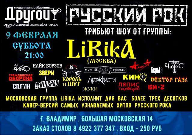 LIRIKA – RUSSIAN COVER BAND – Этим вечером Вас ждёт возвращение во времена, о которых каждый из нас вспоминает с особенным теплом и лёгкой грустью. Московская группа Lirika исполнит для вас более двух десятков кавер-версий самых узнаваемых хитов Русского Рока !!! LiRikA ( russian rock hits `80 `90 `00)