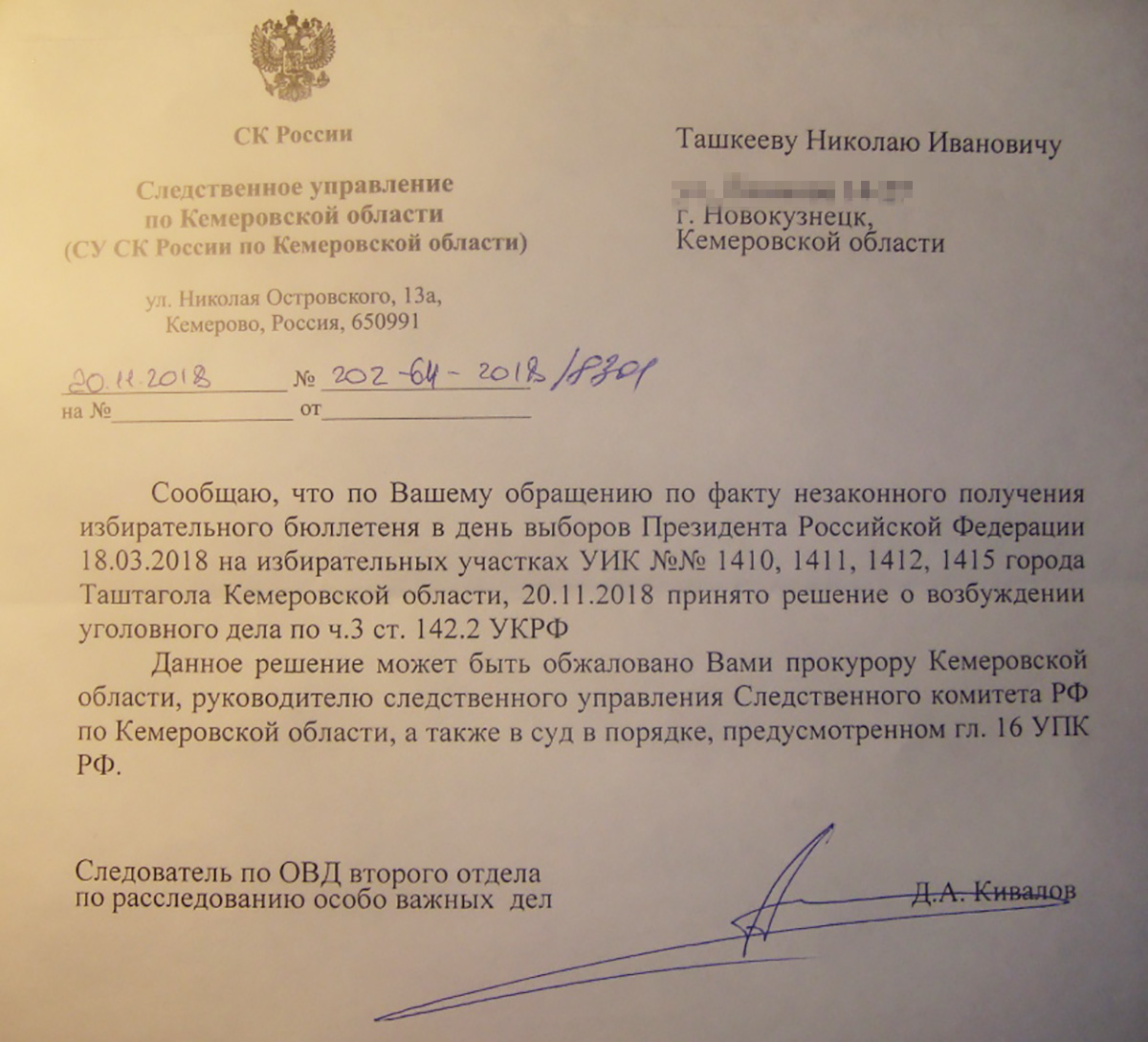 На удивление ход делу был дан. Буквально в этот же день исполняющий обязанности прокурора города Таштагола Н.А. Парамонов передал заявление Ташкеева местному руководителю следственного органа СК по Кемеровской области, а оттуда оно ушло уже в региональный отдел Следственного комитета. Вскоре, 20 ноября 2018 года, следователь по особо важным делам Д.А. Кивалов сообщил заявителю о принятом решении — «возбуждении уголовного дела по ч.3 ст. 142.2 УК РФ».