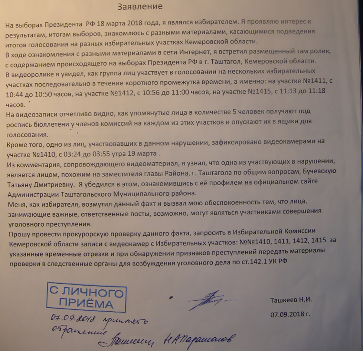 Инициатором возбуждения уголовного дела стал житель Новокузнецка, известный в Кузбассе общественник и борец за чистоту избирательного процесса Николай Ташкеев. Анализируя процесс мартовских президентских выборов 2018 года в городе Таштаголе по видеоархивам, он обратил внимание на группу лиц на различных участках, которая периодически получает под роспись бюллетени и затем опускает их в урны для голосования. По косвенным данным он вскоре узнал, что один из организаторов фальсификаций – заместитель главы Таштагольского муниципального района Татьяна Дмитриевна Бучевская. Затем были установлены личности и других мошенников. Вскоре, 9 сентября 2018 года, от него в прокуратуру города Таштагола поступило соответствующее заявление.