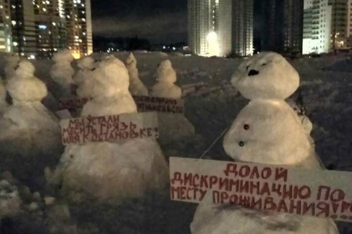 «Мы имеем право на нормальную дорогу»: у несогласованного проезда в Мурине снеговиков с плакатами поставили в «митинг»