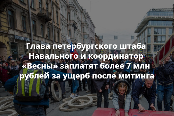 По решению Фрунзенского районного суда глава петербургского штаба Навального Денис Михайлов и координатор движения «Весна» Богдан Литвин выплатят 7,3 млн рублей для возмещения ущерба после митинга 5 мая. Об этом сообщает «Медиазона».